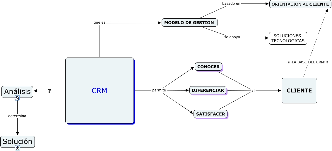 Este Cmap, tiene información relacionada con: Practica CRM, Análisis determina Solución, MODELO DE GESTION basado en ORIENTACION AL CLIENTE, SATISFACER al CLIENTE, CRM permite CONOCER, CRM permite DIFERENCIAR, CRM permite SATISFACER, CRM ? Análisis, CLIENTE ¡¡¡¡LA BASE DEL CRM!!!! ORIENTACION AL CLIENTE, CRM que es MODELO DE GESTION, CONOCER al CLIENTE, DIFERENCIAR al CLIENTE, MODELO DE GESTION se apoya SOLUCIONES TECNOLOGICAS