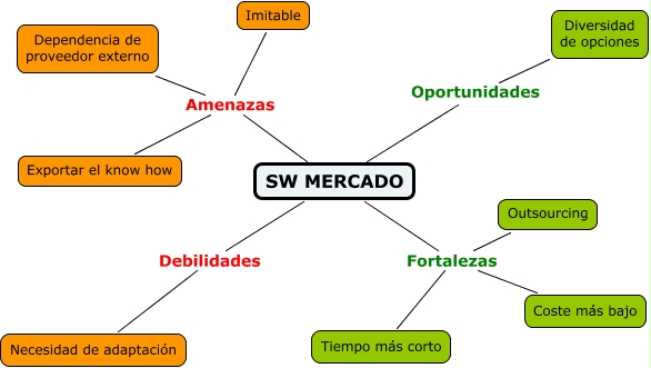 Este Cmap, tiene información relacionada con: CRM NUESTRO DAFO MERCADO, SW MERCADO Debilidades Necesidad de adaptación, SW MERCADO Oportunidades Diversidad de opciones, SW MERCADO Amenazas Imitable, SW MERCADO Fortalezas Coste más bajo, SW MERCADO Amenazas Exportar el know how, SW MERCADO Fortalezas Tiempo más corto, SW MERCADO Amenazas Dependencia de proveedor externo, SW MERCADO Fortalezas Outsourcing