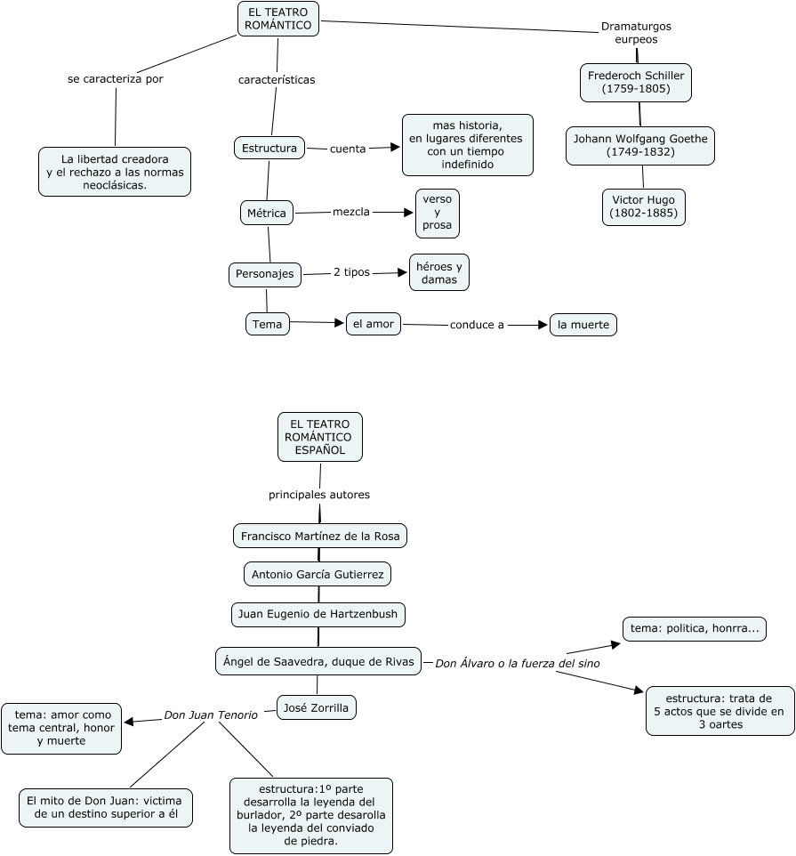 Este Cmap, tiene información relacionada con: Ana Rosa Gómez Alba, el amor conduce a la muerte, Personajes 2 tipos héroes y damas, EL TEATRO ROMÁNTICO ESPAÑOL principales autores Juan Eugenio de Hartzenbush, EL TEATRO ROMÁNTICO ESPAÑOL principales autores José Zorrilla, Ángel de Saavedra, duque de Rivas Don Álvaro o la fuerza del sino estructura: trata de 5 actos que se divide en 3 oartes, José Zorrilla Don Juan Tenorio El mito de Don Juan: victima de un destino superior a él, Métrica ???? Personajes, Estructura cuenta mas historia, en lugares diferentes con un tiempo indefinido, EL TEATRO ROMÁNTICO características Estructura, Métrica mezcla verso y prosa, José Zorrilla Don Juan Tenorio estructura:1º parte desarrolla la leyenda del burlador, 2º parte desarolla la leyenda del conviado de piedra., EL TEATRO ROMÁNTICO Dramaturgos eurpeos Johann Wolfgang Goethe (1749-1832), EL TEATRO ROMÁNTICO se caracteriza por La libertad creadora y el rechazo a las normas neoclásicas., EL TEATRO ROMÁNTICO ESPAÑOL principales autores Ángel de Saavedra, duque de Rivas, EL TEATRO ROMÁNTICO Dramaturgos eurpeos Frederoch Schiller (1759-1805), Estructura ???? Métrica, EL TEATRO ROMÁNTICO ESPAÑOL principales autores Francisco Martínez de la Rosa, Tema ???? el amor, Personajes ???? Tema, José Zorrilla Don Juan Tenorio tema: amor como tema central, honor y muerte