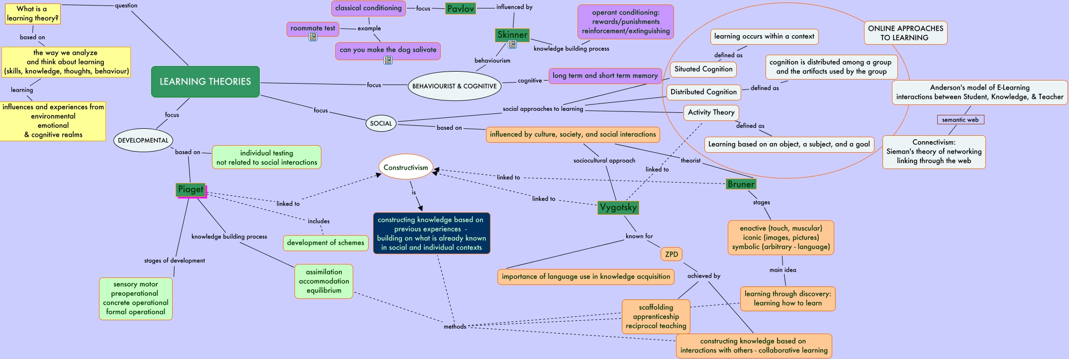 This Concept Map, created with IHMC CmapTools, has information related to: Adi Aharon - Learning Theories-Final, LEARNING THEORIES focus DEVELOPMENTAL, Vygotsky linked to Constructivism, learning through discovery: learning how to learn methods constructing knowledge based on previous experiences - building on what is already known in social and individual contexts, Piaget knowledge building process assimilation accommodation equilibrium, classical conditioning example can you make the dog salivate, LEARNING THEORIES focus SOCIAL, Piaget includes development of schemes, classical conditioning example roommate test, Distributed Cognition defined as cognition is distributed among a group and the artifacts used by the group, DEVELOPMENTAL based on individual testing not related to social interactions, Skinner influenced by Pavlov, Situated Cognition defined as learning occurs within a context, Connectivism: Sieman's theory of networking linking through the web semantic web Anderson's model of E-Learning interactions between Student, Knowledge, & Teacher, Vygotsky known for ZPD, influenced by culture, society, and social interactions theorist Bruner, constructing knowledge based on interactions with others - collaborative learning methods constructing knowledge based on previous experiences - building on what is already known in social and individual contexts, Activity Theory defined as Learning based on an object, a subject, and a goal, ZPD achieved by constructing knowledge based on interactions with others - collaborative learning, influenced by culture, society, and social interactions sociocultural approach Vygotsky, LEARNING THEORIES focus BEHAVIOURIST & COGNITIVE