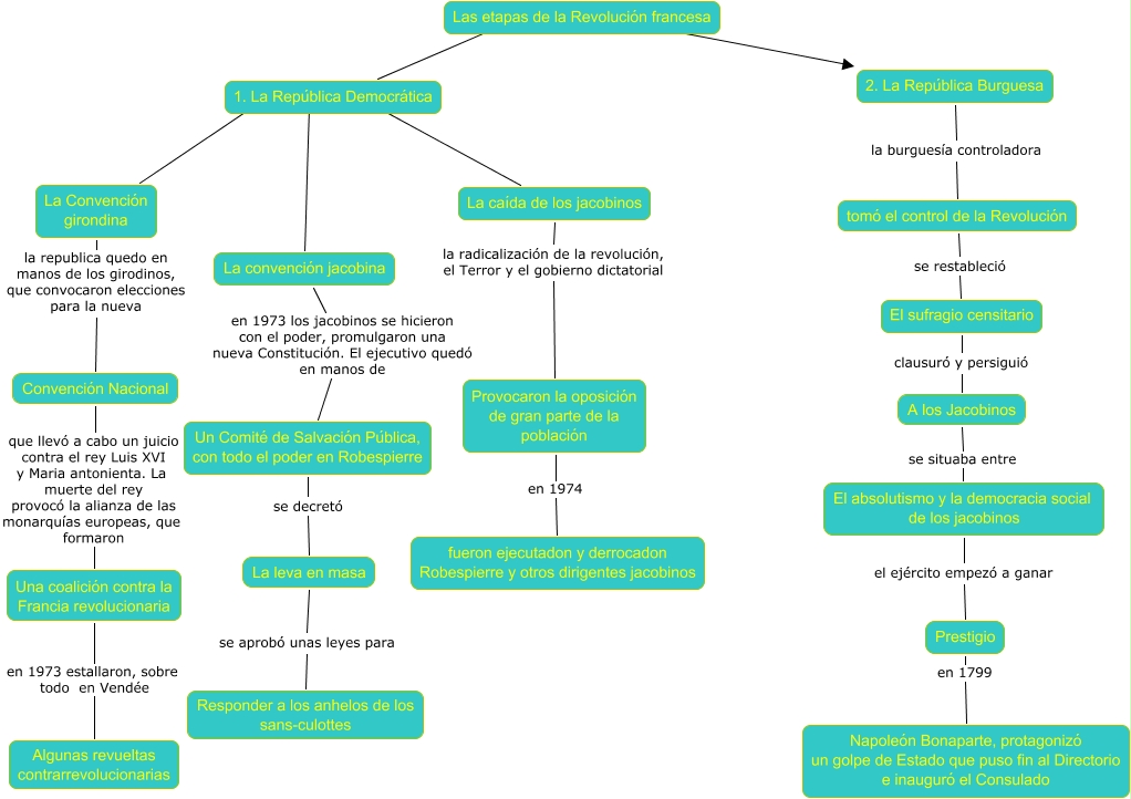 Este Cmap, tiene información relacionada con: Las etapas de la Revolución francesa 2. Luis Yeste Ortega nº31 4ºA, Convención Nacional que llevó a cabo un juicio contra el rey Luis XVI y Maria antonienta. La muerte del rey provocó la alianza de las monarquías europeas, que formaron Una coalición contra la Francia revolucionaria, tomó el control de la Revolución se restableció El sufragio censitario, 1. La República Democrática ???? La caída de los jacobinos, La leva en masa se aprobó unas leyes para Responder a los anhelos de los sans-culottes, A los Jacobinos se situaba entre El absolutismo y la democracia social de los jacobinos, 2. La República Burguesa la burguesía controladora tomó el control de la Revolución, Las etapas de la Revolución francesa ???? 1. La República Democrática, El absolutismo y la democracia social de los jacobinos el ejército empezó a ganar Prestigio, La convención jacobina en 1973 los jacobinos se hicieron con el poder, promulgaron una nueva Constitución. El ejecutivo quedó en manos de Un Comité de Salvación Pública, con todo el poder en Robespierre, La Convención girondina la republica quedo en manos de los girodinos, que convocaron elecciones para la nueva Convención Nacional, La caída de los jacobinos la radicalización de la revolución, el Terror y el gobierno dictatorial Provocaron la oposición de gran parte de la población, El sufragio censitario clausuró y persiguió A los Jacobinos, 1. La República Democrática ???? La convención jacobina, Prestigio en 1799 Napoleón Bonaparte, protagonizó un golpe de Estado que puso fin al Directorio e inauguró el Consulado, 1. La República Democrática ???? La Convención girondina, Un Comité de Salvación Pública, con todo el poder en Robespierre se decretó La leva en masa, Provocaron la oposición de gran parte de la población en 1974 fueron ejecutadon y derrocadon Robespierre y otros dirigentes jacobinos, Una coalición contra la Francia revolucionaria en 1973 estallaron, sobre todo en Vendée Algunas revueltas contrarrevolucionarias, Las etapas de la Revolución francesa ???? 2. La República Burguesa