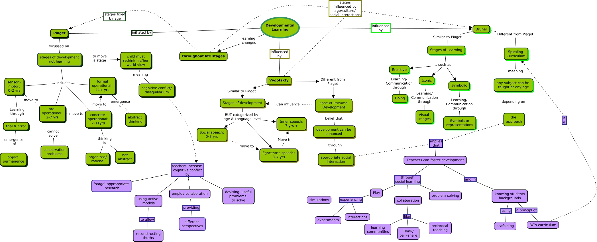 This Concept Map, created with IHMC CmapTools, has information related to: Gioia-Developmental, Stages of Learning such as Symbolic, Iconic Learning/ Communication through Visual images, Play experiencing experiments, Developmental Learning influenced by Vygotskty, Piaget focussed on stages of development not learning, Bruner Different from Piaget Spiraling Curriculum, stages of development not learning includes pre- operational: 2-7 yrs, knowing students backgrounds using scafolding, Egocentric speech: 3-7 yrs Move to Inner speech: 7 yrs +, Vygotskty stages influenced by age/culture/ social interactions Bruner, the approach implies that Teachers can foster development, pre- operational: 2-7 yrs move to concrete operational: 7-11yrs, concrete operational: 7-11yrs thinking is not abstract, concrete operational: 7-11yrs move to formal operational: 11+ yrs, employ collaboration providing different perspectives, throughout life stages stages influenced by age/culture/ social interactions Bruner, Stages of development BUT categorized by age & Language level Egocentric speech: 3-7 yrs, Stages of Learning such as Enactive, concrete operational: 7-11yrs thinking is organized/ rational, sensori- motor: 0-2 yrs move to pre- operational: 2-7 yrs