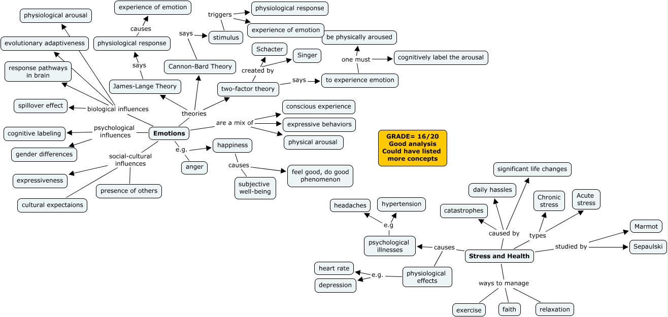 Chapter 11 Emotions, Stress and Health;Isabel Merrick, Emotions psychological influences gender differences, stimulus triggers experience of emotion, Emotions social-cultural influences expressiveness, Emotions e.g. happiness, Stress and Health types Chronic stress, to experience emotion one must cognitively label the arousal, physiological effects e.g. heart rate, happiness causes subjective well-being, Stress and Health ways to manage relaxation, Emotions biological influences spillover effect