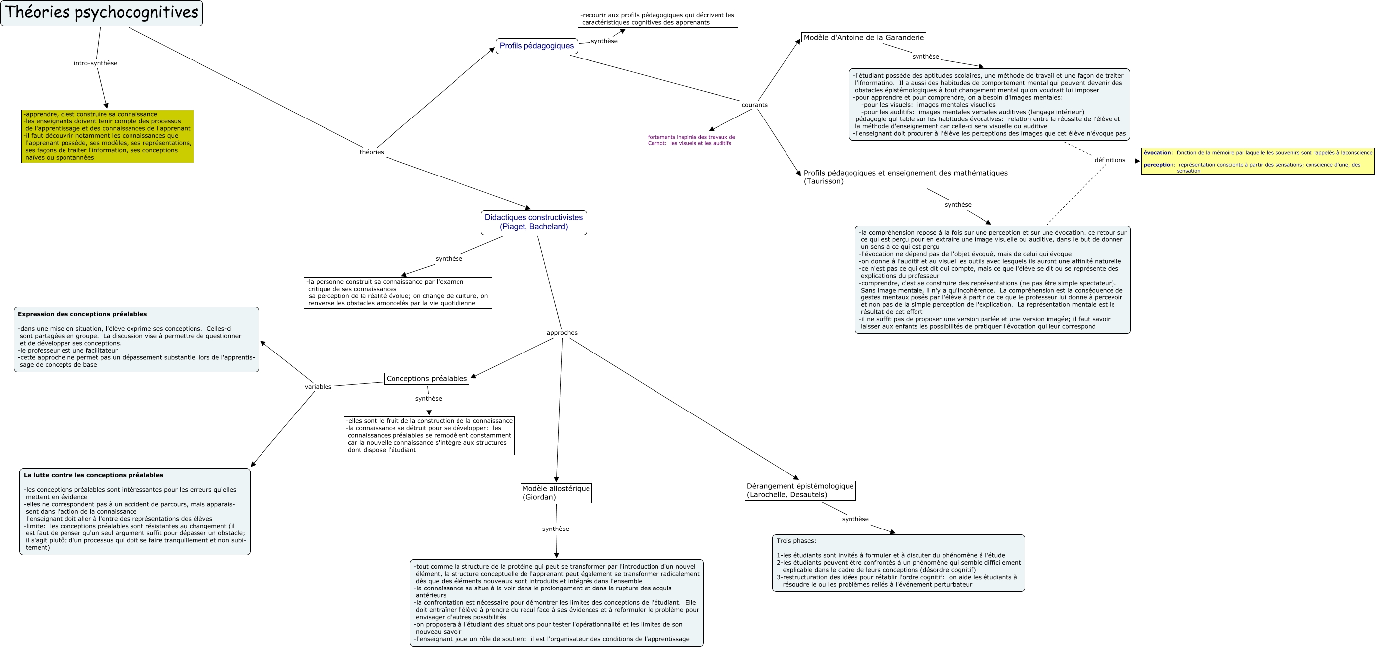 Cette carte conceptuelle, cree avec IHMC CmapTools, contient des informations liees a : Théories psychocognitives, Théories psychocognitives théories Profils pédagogiques, Théories psychocognitives théories Didactiques constructivistes (Piaget, Bachelard), -l'étudiant possède des aptitudes scolaires, une méthode de travail et une façon de traiter l'ifnormatino. Il a aussi des habitudes de comportement mental qui peuvent devenir des obstacles épistémologiques à tout changement mental qu'on voudrait lui imposer -pour apprendre et pour comprendre, on a besoin d'images mentales: -pour les visuels: images mentales visuelles -pour les auditifs: images mentales verbales auditives (langage intérieur) -pédagogie qui table sur les habitudes évocatives: relation entre la réussite de l'élève et la méthode d'enseignement car celle-ci sera visuelle ou auditive -l'enseignant doit procurer à l'élève les perceptions des images que cet élève n'évoque pas définitions évocation: fonction de la mémoire par laquelle les souvenirs sont rappelés à laconscience perception: représentation consciente à partir des sensations; conscience d'une, des sensation, Didactiques constructivistes (Piaget, Bachelard) approches Conceptions préalables, Profils pédagogiques synthèse -recourir aux profils pédagogiques qui décrivent les caractéristiques cognitives des apprenants, Didactiques constructivistes (Piaget, Bachelard) synthèse -la personne construit sa connaissance par l'examen critique de ses connaissances -sa perception de la réalité évolue; on change de culture, on renverse les obstacles amoncelés par la vie quotidienne, Modèle allostérique (Giordan) synthèse -tout comme la structure de la protéine qui peut se transformer par l'introduction d'un nouvel élément, la structure conceptuelle de l'apprenant peut également se transformer radicalement dès que des éléments nouveaux sont introduits et intégrés dans l'ensemble -la connaissance se situe à la voir dans le prolongement et dans la rupture des acquis antérieurs -la confrontation est nécessaire pour démontrer les limites des conceptions de l'étudiant. Elle doit entraîner l'élève à prendre du recul face à ses évidences et à reformuler le problème pour envisager d'autres possibilités -on proposera à l'étudiant des situations pour tester l'opérationnalité et les limites de son nouveau savoir -l'enseignant joue un rôle de soutien: il est l'organisateur des conditions de l'apprentissage, Didactiques constructivistes (Piaget, Bachelard) approches Dérangement épistémologique (Larochelle, Desautels), Conceptions préalables variables La lutte contre les conceptions préalables -les conceptions préalables sont intéressantes pour les erreurs qu'elles mettent en évidence -elles ne correspondent pas à un accident de parcours, mais apparais- sent dans l'action de la connaissance -l'enseignant doit aller à l'entre des représentations des élèves -limite: les conceptions préalables sont résistantes au changement (il est faut de penser qu'un seul argument suffit pour dépasser un obstacle; il s'agit plutôt d'un processus qui doit se faire tranquillement et non subi- tement), Conceptions préalables variables Expression des conceptions préalables -dans une mise en situation, l'élève exprime ses conceptions. Celles-ci sont partagées en groupe. La discussion vise à permettre de questionner et de développer ses conceptions. -le professeur est une facilitateur -cette approche ne permet pas un dépassement substantiel lors de l'apprentis- sage de concepts de base, Modèle d'Antoine de la Garanderie synthèse -l'étudiant possède des aptitudes scolaires, une méthode de travail et une façon de traiter l'ifnormatino. Il a aussi des habitudes de comportement mental qui peuvent devenir des obstacles épistémologiques à tout changement mental qu'on voudrait lui imposer -pour apprendre et pour comprendre, on a besoin d'images mentales: -pour les visuels: images mentales visuelles -pour les auditifs: images mentales verbales auditives (langage intérieur) -pédagogie qui table sur les habitudes évocatives: relation entre la réussite de l'élève et la méthode d'enseignement car celle-ci sera visuelle ou auditive -l'enseignant doit procurer à l'élève les perceptions des images que cet élève n'évoque pas, Conceptions préalables synthèse -elles sont le fruit de la construction de la connaissance -la connaissance se détruit pour se développer: les connaissances préalables se remodèlent constamment car la nouvelle connaissance s'intègre aux structures dont dispose l'étudiant, Profils pédagogiques courants Modèle d'Antoine de la Garanderie, Profils pédagogiques courants fortements inspirés des travaux de Carnot: les visuels et les auditifs, Didactiques constructivistes (Piaget, Bachelard) approches Modèle allostérique (Giordan), Profils pédagogiques courants Profils pédagogiques et enseignement des mathématiques (Taurisson), Théories psychocognitives intro-synthèse -apprendre, c'est construire sa connaissance -les enseignants doivent tenir compte des processus de l'apprentissage et des connaissances de l'apprenant -il faut découvrir notamment les connaissances que l'apprenant possède, ses modèles, ses représentations, ses façons de traiter l'information, ses conceptions naïves ou spontannées, Profils pédagogiques et enseignement des mathématiques (Taurisson) synthèse -la compréhension repose à la fois sur une perception et sur une évocation, ce retour sur ce qui est perçu pour en extraire une image visuelle ou auditive, dans le but de donner un sens à ce qui est perçu -l'évocation ne dépend pas de l'objet évoqué, mais de celui qui évoque -on donne à l'auditif et au visuel les outils avec lesquels ils auront une affinité naturelle -ce n'est pas ce qui est dit qui compte, mais ce que l'élève se dit ou se représente des explications du professeur -comprend