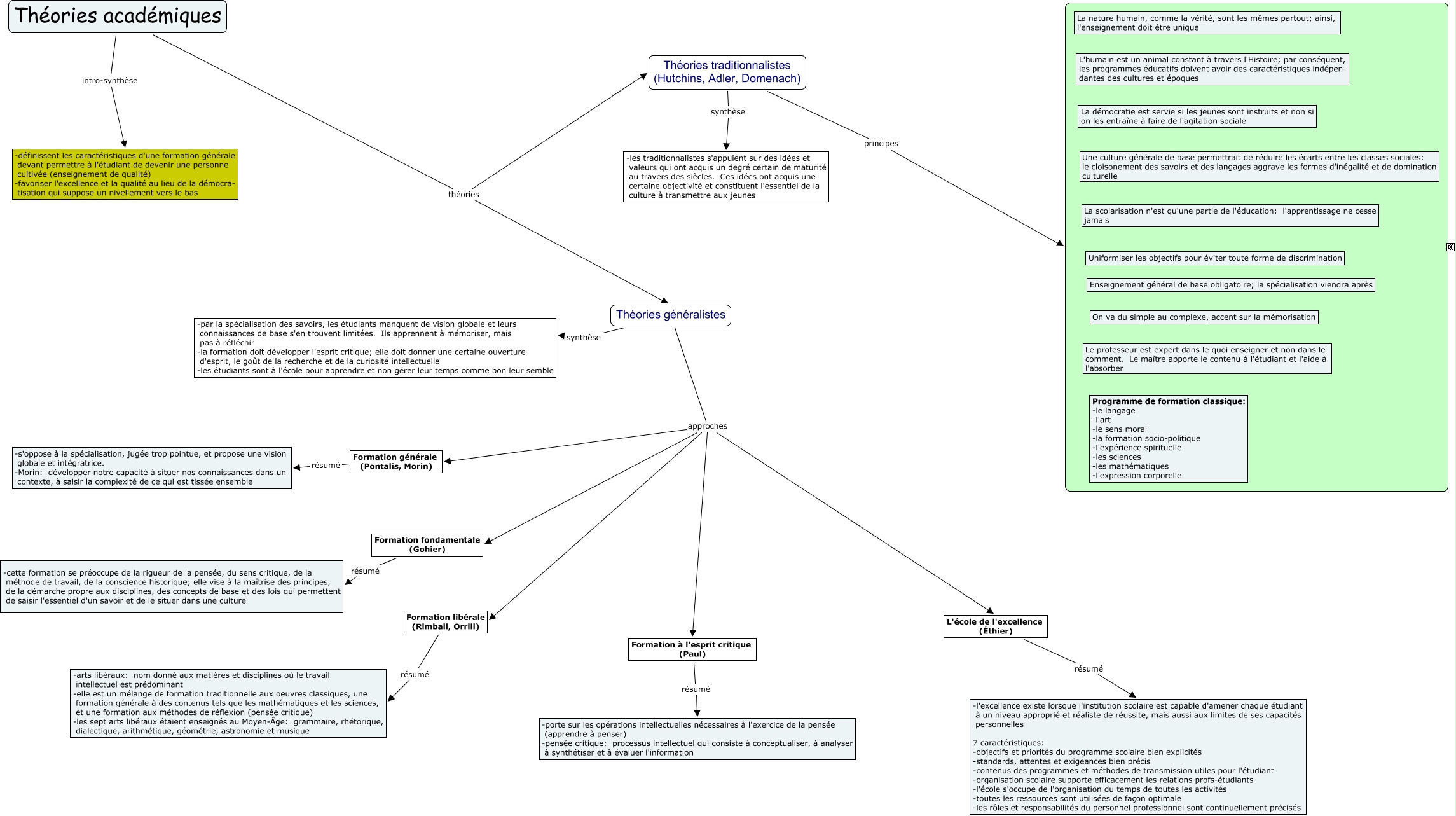 Cette carte conceptuelle, cree avec IHMC CmapTools, contient des informations liees a : Théories académiques, Formation à l'esprit critique (Paul) résumé -porte sur les opérations intellectuelles nécessaires à l'exercice de la pensée (apprendre à penser) -pensée critique: processus intellectuel qui consiste à conceptualiser, à analyser à synthétiser et à évaluer l'information, Théories académiques théories Théories généralistes, Théories académiques théories Théories traditionnalistes (Hutchins, Adler, Domenach), Formation libérale (Rimball, Orrill) résumé -arts libéraux: nom donné aux matières et disciplines où le travail intellectuel est prédominant -elle est un mélange de formation traditionnelle aux oeuvres classiques, une formation générale à des contenus tels que les mathématiques et les sciences, et une formation aux méthodes de réflexion (pensée critique) -les sept arts libéraux étaient enseignés au Moyen-Âge: grammaire, rhétorique, dialectique, arithmétique, géométrie, astronomie et musique, Formation générale (Pontalis, Morin) résumé -s'oppose à la spécialisation, jugée trop pointue, et propose une vision globale et intégratrice. -Morin: développer notre capacité à situer nos connaissances dans un contexte, à saisir la complexité de ce qui est tissée ensemble, Théories traditionnalistes (Hutchins, Adler, Domenach) synthèse -les traditionnalistes s'appuient sur des idées et valeurs qui ont acquis un degré certain de maturité au travers des siècles. Ces idées ont acquis une certaine objectivité et constituent l'essentiel de la culture à transmettre aux jeunes, Théories généralistes approches Formation générale (Pontalis, Morin), Théories généralistes synthèse -par la spécialisation des savoirs, les étudiants manquent de vision globale et leurs connaissances de base s'en trouvent limitées. Ils apprennent à mémoriser, mais pas à réfléchir -la formation doit développer l'esprit critique; elle doit donner une certaine ouverture d'esprit, le goût de la recherche et de la curiosité intellectuelle -les étudiants sont à l'école pour apprendre et non gérer leur temps comme bon leur semble, Théories généralistes approches Formation libérale (Rimball, Orrill), Théories généralistes approches Formation fondamentale (Gohier), L'école de l'excellence (Éthier) résumé -l'excellence existe lorsque l'institution scolaire est capable d'amener chaque étudiant à un niveau approprié et réaliste de réussite, mais aussi aux limites de ses capacités personnelles 7 caractéristiques: -objectifs et priorités du programme scolaire bien explicités -standards, attentes et exigeances bien précis -contenus des programmes et méthodes de transmission utiles pour l'étudiant -organisation scolaire supporte efficacement les relations profs-étudiants -l'école s'occupe de l'organisation du temps de toutes les activités -toutes les ressources sont utilisées de façon optimale -les rôles et responsabilités du personnel professionnel sont continuellement précisés, Théories généralistes approches L'école de l'excellence (Éthier), Théories traditionnalistes (Hutchins, Adler, Domenach) principes ????, Théories généralistes approches Formation à l'esprit critique (Paul), Théories académiques intro-synthèse -définissent les caractéristiques d'une formation générale devant permettre à l'étudiant de devenir une personne cultivée (enseignement de qualité) -favoriser l'excellence et la qualité au lieu de la démocra- tisation qui suppose un nivellement vers le bas, Formation fondamentale (Gohier) résumé -cette formation se préoccupe de la rigueur de la pensée, du sens critique, de la méthode de travail, de la conscience historique; elle vise à la maîtrise des principes, de la démarche propre aux disciplines, des concepts de base et des lois qui permettent de saisir l'essentiel d'un savoir et de le situer dans une culture