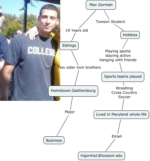 This Concept Map, created with IHMC CmapTools, has information related to: max gorman cmap, Max Gorman Towson Student Hobbies, Hobbies Playing sports staying active hanging with friends Sports teams played, Sports teams played Wrestling Cross Country Soccer Lived in Maryland whole life, Hometown:Gaithersburg Major Buisness, Lived in Maryland whole life Email mgorma1@towson.edu, Max Gorman 19 Years old Siblings, Siblings Two older twin brothers Hometown:Gaithersburg