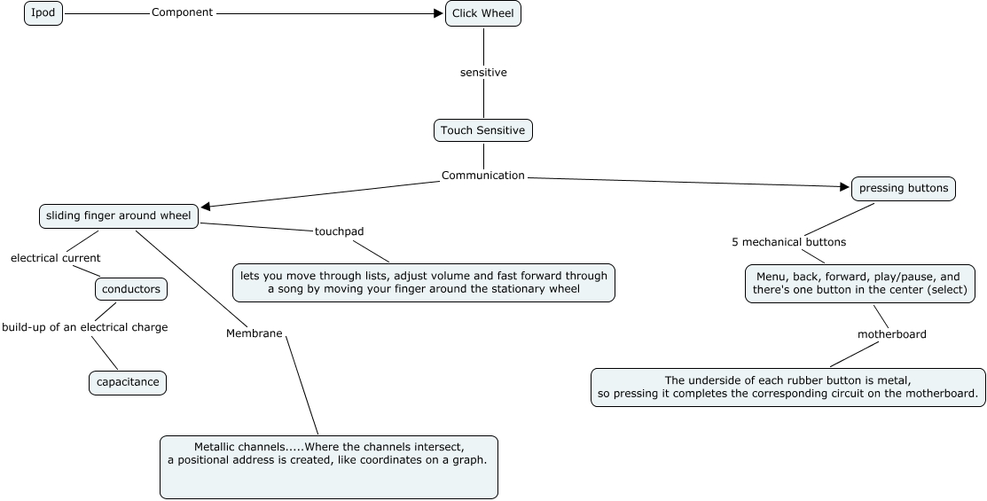 This Concept Map, created with IHMC CmapTools, has information related to: Brittney---Technology, conductors build-up of an electrical charge capacitance, Touch Sensitive Communication pressing buttons, Click Wheel sensitive Touch Sensitive, Menu, back, forward, play/pause, and there's one button in the center (select) motherboard The underside of each rubber button is metal, so pressing it completes the corresponding circuit on the motherboard., Touch Sensitive Communication sliding finger around wheel, sliding finger around wheel Membrane Metallic channels.....Where the channels intersect, a positional address is created, like coordinates on a graph., sliding finger around wheel electrical current conductors, sliding finger around wheel touchpad lets you move through lists, adjust volume and fast forward through a song by moving your finger around the stationary wheel, pressing buttons 5 mechanical buttons Menu, back, forward, play/pause, and there's one button in the center (select), Ipod Component Click Wheel