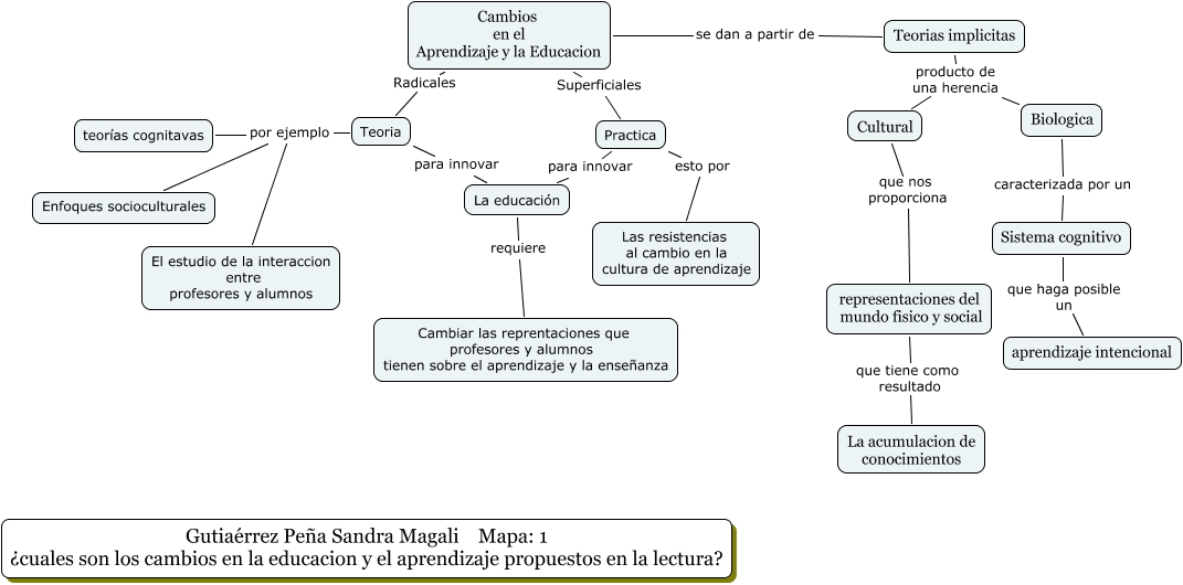 Este Cmap, tiene información relacionada con: nuevas formas de pensar la enseñanza y el aprendizaje 1.0, Sistema cognitivo que haga posible un aprendizaje intencional, Cambios en el Aprendizaje y la Educacion Superficiales Practica, Teorias implicitas producto de una herencia Cultural, Biologica caracterizada por un Sistema cognitivo, Practica esto por Las resistencias al cambio en la cultura de aprendizaje, Enfoques socioculturales por ejemplo El estudio de la interaccion entre profesores y alumnos, Teorias implicitas producto de una herencia Biologica, Teoria por ejemplo teorías cognitavas, representaciones del mundo fisico y social que tiene como resultado La acumulacion de conocimientos, La educación requiere Cambiar las reprentaciones que profesores y alumnos tienen sobre el aprendizaje y la enseñanza, Teoria por ejemplo El estudio de la interaccion entre profesores y alumnos, Cultural que nos proporciona representaciones del mundo fisico y social, Teoria para innovar La educación, Practica para innovar La educación, Cambios en el Aprendizaje y la Educacion Radicales Teoria, Enfoques socioculturales por ejemplo teorías cognitavas, Cambios en el Aprendizaje y la Educacion se dan a partir de Teorias implicitas