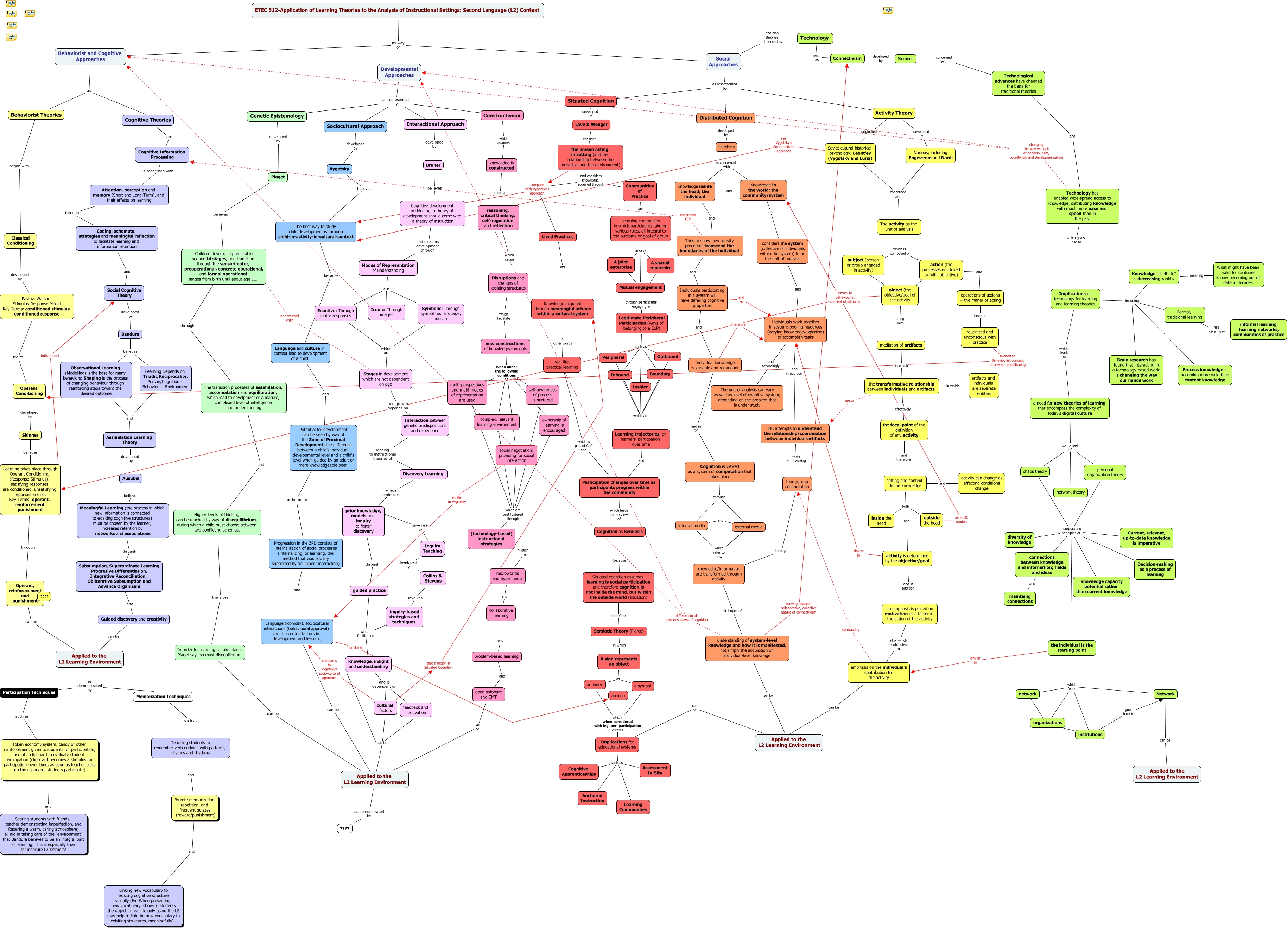 This Concept Map, created with IHMC CmapTools, has information related to: ETEC 512 Content -Draft 4, Subsumption, Superordinate Learning Progresive Differentiation, Integrative Reconciliation, Obliterative Subsumption and Advance Organizers and Guided discovery and creativity, network theory incorporating principles of knowledge capacity potential rather than current knowledge, Stages in development which are not dependent on age and growth depends on Interaction between genetic predispositions and experience, social negotiation: providing for social interaction similar to Vygotsky Language (iconicity), sociocultural interactions (behavioural approval) are the central factors in development and learning, internal media and external media, Higher levels of thinking can be reached by way of disequilibrium, during which a child must choose between two conflicting schemata therefore In order for learning to take place, Piaget says so must disequilibrium, A joint enterprise ???? Mutual engagement, microworlds and hypermedia and collaborative learning, new constructions of knowledge/concepts when under the following conditions complex, relevant learning environment, real-life, practical learning which is part of CoP and Participation changes over time as participants progress within the community, the transformative relationship between individuals and artifacts unlike DC attempts to understand the relationship/coordination between individual-artifacts, cultural factors compares to Vygotsky's socio-cultural approach Language (iconicity), sociocultural interactions (behavioural approval) are the central factors in development and learning, Social Cognitive Theory developed by Bandura, new constructions of knowledge/concepts when under the following conditions self-awareness of process is nurtured, prior knowledge, models and inquiry to foster discovery gave rise to Inquiry Teaching, Teaching students to remember verb endings with patterns, rhymes and rhythms and By rote memorization, repetition, and frequent quizzes (reward/punishment), Implications for educational systems such as Cognitive Apprenticeships, Social Approaches as respresented by Situated Cognition, The best way to study child development is through child-in-activity-in-cultural-context because Language and culture in context lead to development of a child, Soviet cutural-historical psychology; Leont'ev (Vygotsky and Luria) see Vygotsky's Socio-cultural approach The best way to study child development is through child-in-activity-in-cultural-context
