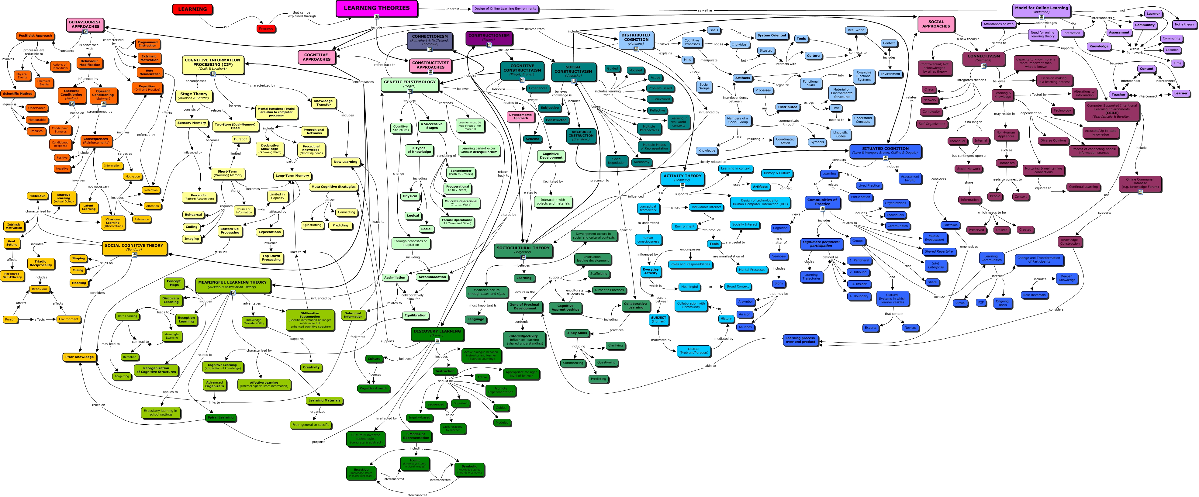 This Concept Map, created with IHMC CmapTools, has information related to: NatalieGiesbrecht_Draft4, Behaviour Modification influenced by Operant Conditioning (Skinner), Consequences (Reinforcements) not necessary Latent Learning, BEHAVIOURIST APPROACHES characterized by Programmed Instruction, DISCOVERY LEARNING (Bruner) relates back to GENETIC EPISTEMOLOGY (Piaget), MEANINGFUL LEARNING THEORY (Ausubel's Assimilation Theory) includes Reception Learning, LEARNING THEORIES include CONSTRUCTIVIST APPROACHES, MEANINGFUL LEARNING THEORY (Ausubel's Assimilation Theory) characterized by Meta Cognitive Strategies, CONNECTIVISM (Siemens) supports Computer Supported Intentional Learning Environments (CSILE) (Scardamalia & Bereiter), Subsumed Information links to Long-Term Memory, Communities of Practice relates to Shared Repertoire, SOCIAL COGNITIVE THEORY (Bandura) characterized by FEEDBACK, Non-Human Appliances such as Databases, Databases needs to connect to People, Stage Theory (Atkinson & Shriffin) relates to Two-Store (Dual-Memory) Model, 4 Key Skills including Clarifying, MEANINGFUL LEARNING THEORY (Ausubel's Assimilation Theory) applies to Expository learning in school settings, BEHAVIOURIST APPROACHES is concerned with Behaviour Modification, Short-Term (Working) Memory limited Duration, Assimilation collaboratively allow for Equilibration, Communities of Practice relates to Mutual Engagement
