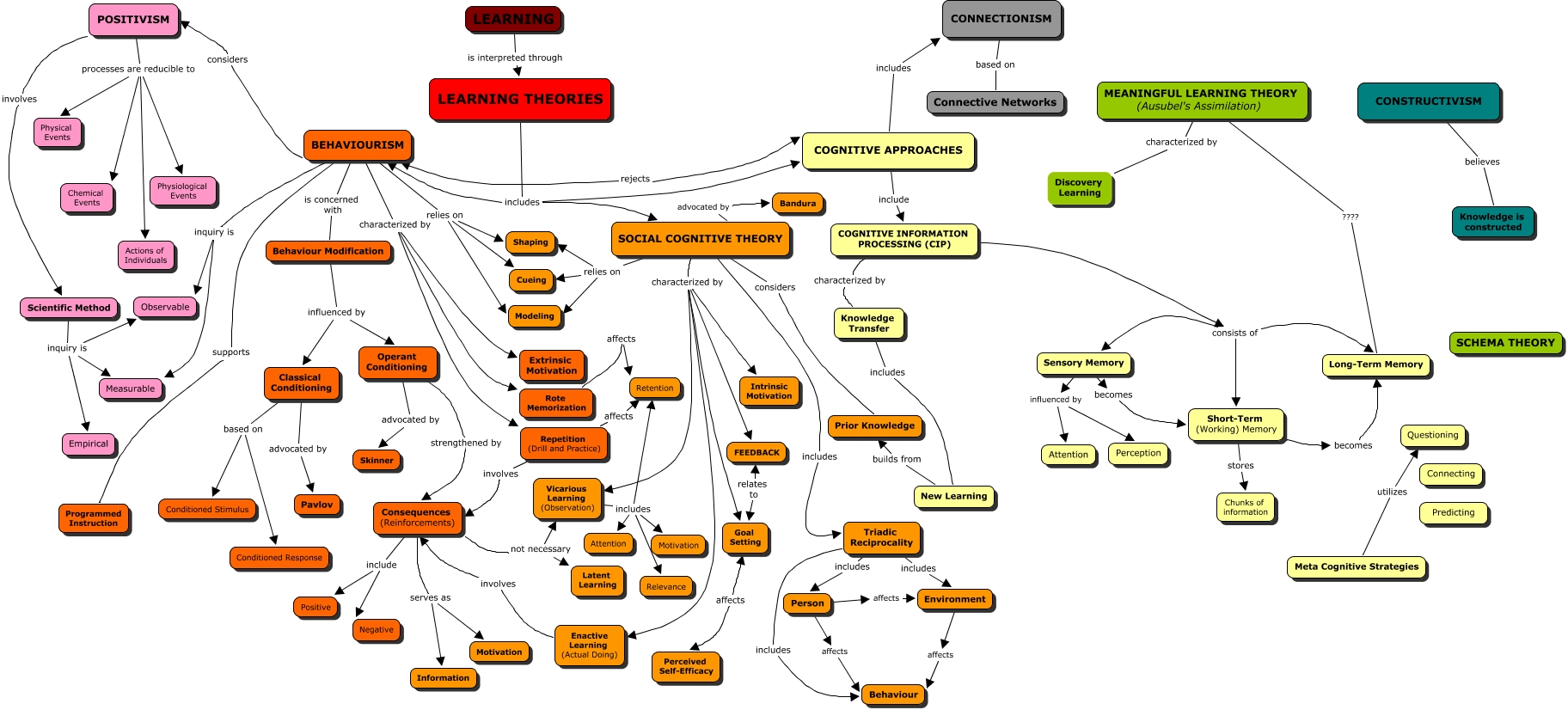 This Concept Map, created with IHMC CmapTools, has information related to: NatalieGiesbrecht_Draft1, COGNITIVE INFORMATION PROCESSING (CIP) consists of Sensory Memory, POSITIVISM involves Scientific Method, Triadic Reciprocality includes Person, Behaviour Modification influenced by Operant Conditioning, LEARNING THEORIES includes SOCIAL COGNITIVE THEORY, BEHAVIOURISM relies on Cueing, BEHAVIOURISM characterized by Rote Memorization, SOCIAL COGNITIVE THEORY relies on Modeling, Operant Conditioning strengthened by Consequences (Reinforcements), SOCIAL COGNITIVE THEORY relies on Shaping, COGNITIVE INFORMATION PROCESSING (CIP) consists of Short-Term (Working) Memory, COGNITIVE INFORMATION PROCESSING (CIP) characterized by Knowledge Transfer, Classical Conditioning advocated by Pavlov, Sensory Memory influenced by Attention, BEHAVIOURISM inquiry is Observable, Sensory Memory influenced by Perception, Consequences (Reinforcements) serves as Information, Environment affects Behaviour, Short-Term (Working) Memory stores Chunks of information, Triadic Reciprocality includes Behaviour