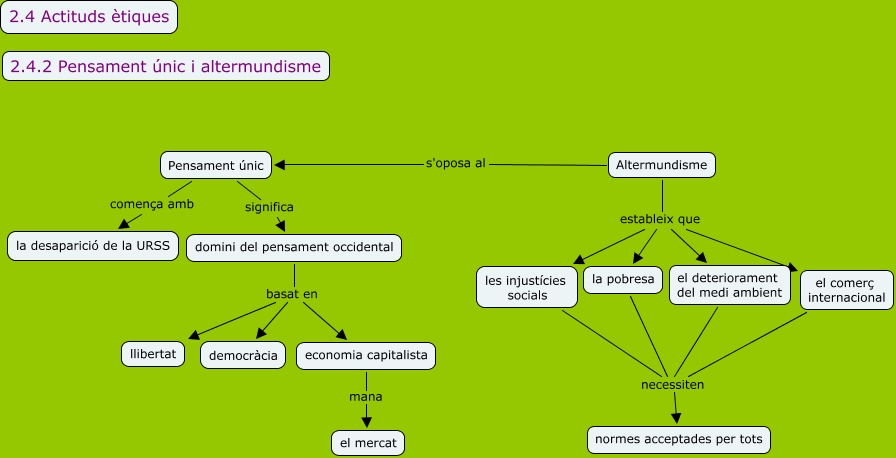 Aquest mapa conceptual conté informació relacionada amb: 2.4.2 Pensament únic i altermundisme, Altermundisme s'oposa al Pensament únic, domini del pensament occidental basat en economia capitalista, el comerç internacional necessiten normes acceptades per tots, la pobresa necessiten normes acceptades per tots, les injustícies socials necessiten normes acceptades per tots, el deteriorament del medi ambient necessiten normes acceptades per tots, Altermundisme estableix que la pobresa, Altermundisme estableix que el comerç internacional, Pensament únic significa domini del pensament occidental, economia capitalista mana el mercat, domini del pensament occidental basat en llibertat, Altermundisme estableix que el deteriorament del medi ambient, Altermundisme estableix que les injustícies socials, domini del pensament occidental basat en democràcia, Pensament únic comença amb la desaparició de la URSS