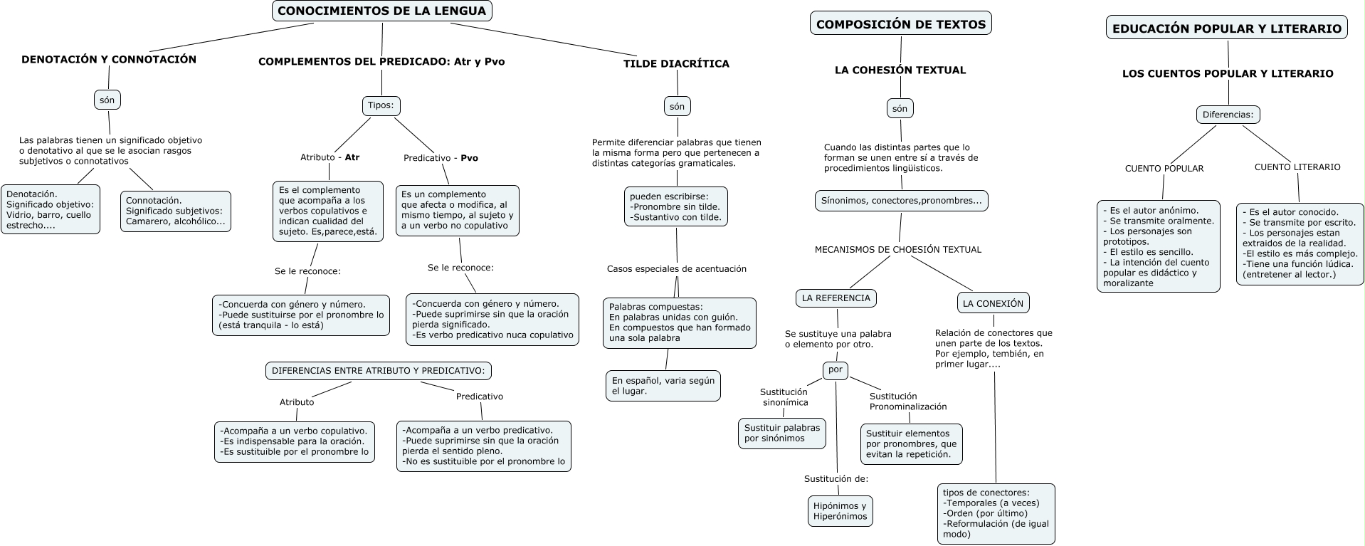 Este Cmap, tiene información relacionada con: CASTELLA TEMA-4, por Sustitución de: Hipónimos y Hiperónimos, CONOCIMIENTOS DE LA LENGUA TILDE DIACRÍTICA són, por Sustitución sinonímica Sustituir palabras por sinónimos, pueden escribirse: -Pronombre sin tilde. -Sustantivo con tilde. Casos especiales de acentuación Palabras compuestas: En palabras unidas con guión. En compuestos que han formado una sola palabra, Diferencias: CUENTO LITERARIO - Es el autor conocido. - Se transmite por escrito. - Los personajes estan extraidos de la realidad. -El estilo es más complejo. -Tiene una función lúdica. (entretener al lector.), Tipos: Predicativo - Pvo Es un complemento que afecta o modifica, al mismo tiempo, al sujeto y a un verbo no copulativo, Sínonimos, conectores,pronombres... MECANISMOS DE CHOESIÓN TEXTUAL LA CONEXIÓN, por Sustitución Pronominalización Sustituir elementos por pronombres, que evitan la repetición., pueden escribirse: -Pronombre sin tilde. -Sustantivo con tilde. Casos especiales de acentuación En español, varia según el lugar., CONOCIMIENTOS DE LA LENGUA DENOTACIÓN Y CONNOTACIÓN són, són Las palabras tienen un significado objetivo o denotativo al que se le asocian rasgos subjetivos o connotativos Connotación. Significado subjetivos: Camarero, alcohólico..., són Las palabras tienen un significado objetivo o denotativo al que se le asocian rasgos subjetivos o connotativos Denotación. Significado objetivo: Vidrio, barro, cuello estrecho...., EDUCACIÓN POPULAR Y LITERARIO LOS CUENTOS POPULAR Y LITERARIO Diferencias:, DIFERENCIAS ENTRE ATRIBUTO Y PREDICATIVO: Predicativo -Acompaña a un verbo predicativo. -Puede suprimirse sin que la oración pierda el sentido pleno. -No es sustituible por el pronombre lo, DIFERENCIAS ENTRE ATRIBUTO Y PREDICATIVO: Atributo -Acompaña a un verbo copulativo. -Es indispensable para la oración. -Es sustituible por el pronombre lo, Es el complemento que acompaña a los verbos copulativos e indican cualidad del sujeto. Es,parece,está. Se le reconoce: -Concuerda con género y número. -Puede sustituirse por el pronombre lo (está tranquila - lo está), són Permite diferenciar palabras que tienen la misma forma pero que pertenecen a distintas categorías gramaticales. pueden escribirse: -Pronombre sin tilde. -Sustantivo con tilde., COMPOSICIÓN DE TEXTOS LA COHESIÓN TEXTUAL són, són Cuando las distintas partes que lo forman se unen entre sí a través de procedimientos lingüisticos. Sínonimos, conectores,pronombres..., Sínonimos, conectores,pronombres... MECANISMOS DE CHOESIÓN TEXTUAL LA REFERENCIA