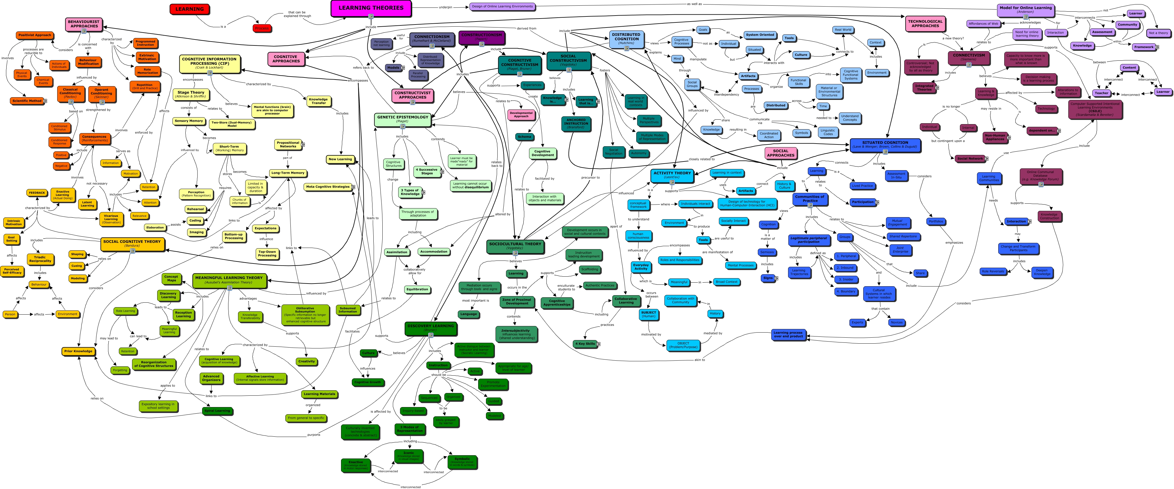 This Concept Map, created with IHMC CmapTools, has information related to: NatalieGiesbrecht_Nov22A, Behaviour Modification influenced by Operant Conditioning (Skinner), Consequences (Reinforcements) not necessary Latent Learning, BEHAVIOURIST APPROACHES characterized by Programmed Instruction, DISCOVERY LEARNING (Bruner) relates back to GENETIC EPISTEMOLOGY (Piaget), Learning Communities needs Interaction, MEANINGFUL LEARNING THEORY (Ausubel's Assimilation Theory) includes Reception Learning, LEARNING THEORIES include CONSTRUCTIVIST APPROACHES, CONNECTIVISM (Siemens) supports Computer Supported Intentional Learning Environments (CSILE) (Scardamalia & Bereiter), Subsumed Information links to Long-Term Memory, Semiosis includes Signs, CONNECTIONISM (Rumelhart & McClelland) include Models, SOCIAL COGNITIVE THEORY (Bandura) characterized by FEEDBACK, Databases needs to connect to People, Stage Theory (Atkinson & Shriffin) relates to Two-Store (Dual-Memory) Model, MEANINGFUL LEARNING THEORY (Ausubel's Assimilation Theory) applies to Expository learning in school settings, BEHAVIOURIST APPROACHES is concerned with Behaviour Modification, Assimilation collaboratively allow for Equilibration, Chunks of information is Limited in capacity & duration, Artifacts connects to Real World, SUBJECT (Human) motivated by OBJECT (Problem/Purpose)