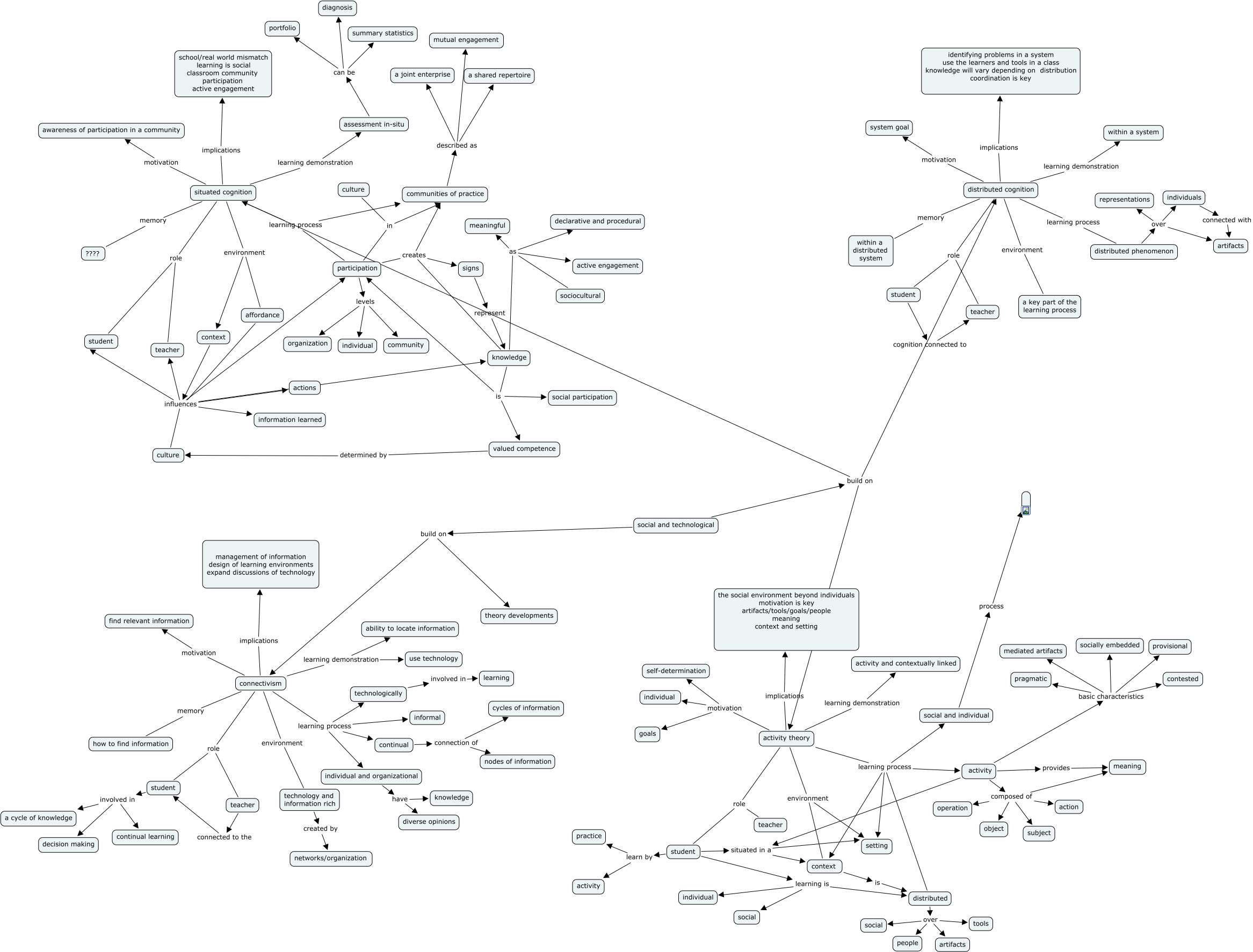 This Concept Map, created with IHMC CmapTools, has information related to: Social, situated cognition memory ????, knowledge as meaningful, situated cognition implications school/real world mismatch learning is social classroom community participation active engagement, connectivism implications management of information design of learning environments expand discussions of technology, distributed cognition implications identifying problems in a system use the learners and tools in a class knowledge will vary depending on distribution coordination is key, social and technological build on distributed cognition, communities of practice described as mutual engagement, individual and organizational have knowledge, activity theory environment context, distributed over social, distributed over tools, context influences culture, knowledge as active engagement, situated cognition environment affordance, activity composed of operation, connectivism learning demonstration ability to locate information, affordance influences student, continual connection of cycles of information, distributed cognition learning process distributed phenomenon, situated cognition role student