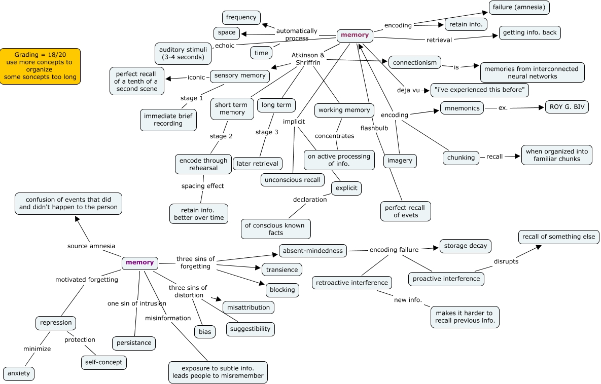 Ch. 8 Memory; Lindsey Phillippe, encode through rehearsal spacing effect retain info. better over time, retroactive interference new info. makes it harder to recall previous info., memory source amnesia confusion of events that did and didn't happen to the person, memory three sins of distortion suggestibility, memory deja vu "i've experienced this before", memory Atkinson & Shriffrin long term, memory Atkinson & Shriffrin short term memory, chunking recall when organized into familiar chunks, memory Atkinson & Shriffrin connectionism, working memory concentrates on active processing of info.