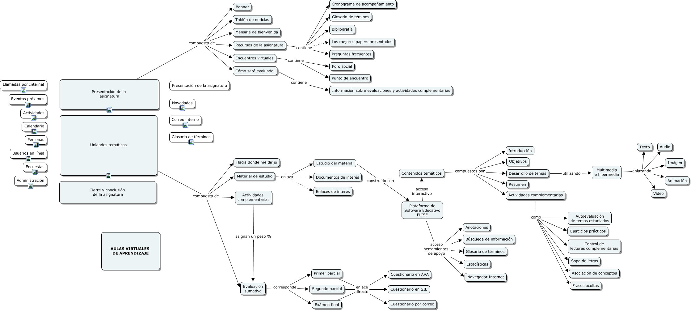 Este Cmap, tiene información relacionada con: Estructura Aula Virtual, Desarrollo de temas utilizando Multimedia e hipermedia, Presentación de la asignatura compuesta de Banner, Contenidos temáticos compuestos por Introducción, Primer parcial enlace directo Cuestionario en AVA, Presentación de la asignatura compuesta de Cómo seré evaluado!, Segundo parcial enlace directo Cuestionario en SIE, Recursos de la asignatura contiene Bibliografía, Segundo parcial enlace directo Cuestionario por correo, Primer parcial enlace directo Cuestionario en SIE, Presentación de la asignatura compuesta de Tablón de noticias, Multimedia e hipermedia enlazando Audio, Actividades complementarias asignan un peso % Evaluación sumativa, Exámen final enlace directo Cuestionario en AVA, Presentación de la asignatura compuesta de Mensaje de bienvenida, Presentación de la asignatura compuesta de Recursos de la asignatura, Estudio del material construído con Plataforma de Software Educativo PLISE, Multimedia e hipermedia enlazando Imágen, Plataforma de Software Educativo PLISE acceso herramientas de apoyo Estadísticas, Multimedia e hipermedia enlazando Animación, Cómo seré evaluado! contiene Información sobre evaluaciones y actividades complementarias