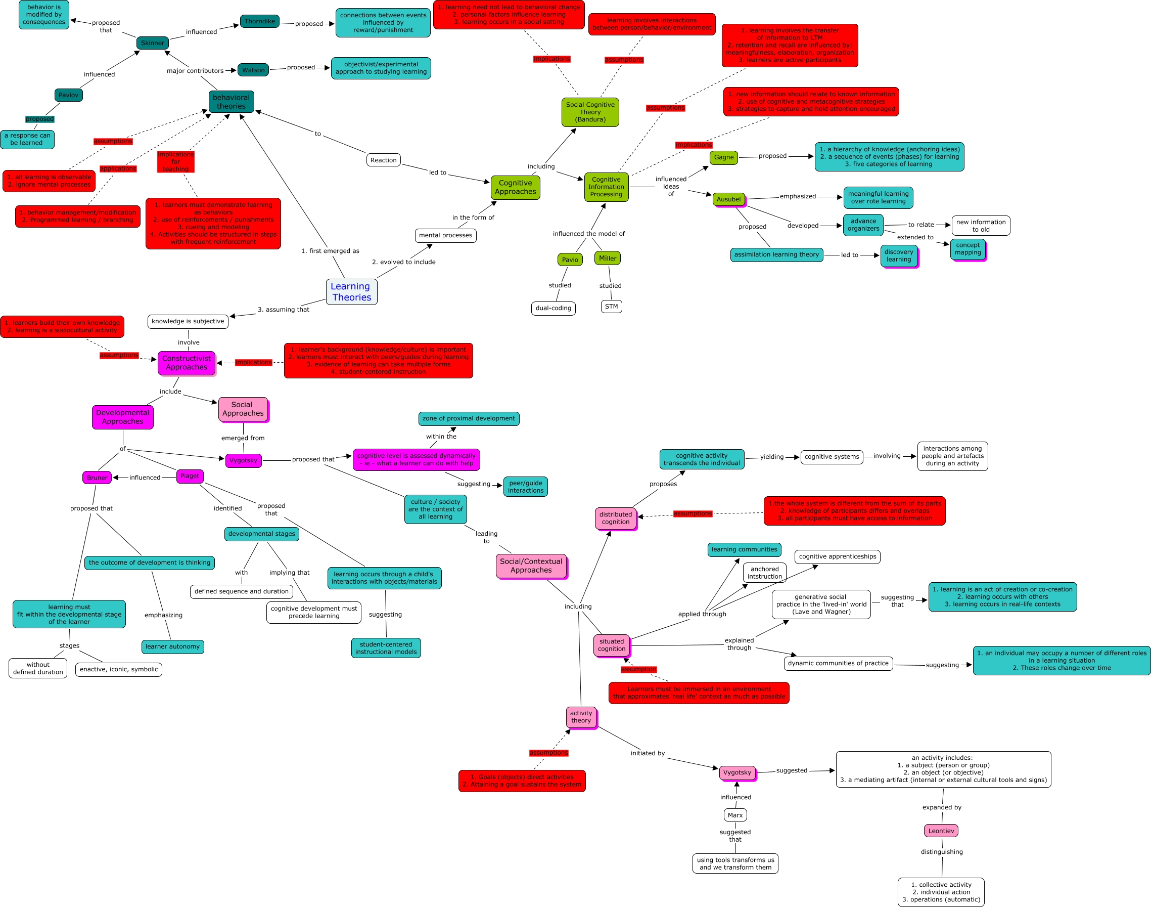 This Concept Map, created with IHMC CmapTools, has information related to: Emily Jarvis Learning Theories Final, Reaction to behavioral theories, Gagne proposed 1. a hierarchy of knowledge (anchoring ideas) 2. a sequence of events (phases) for learning 3. five categories of learning, Cognitive Information Processing influenced ideas of Gagne, Constructivist Approaches include Social Approaches, Watson proposed objectivist/experimental approach to studying learning, Piaget proposed that learning occurs through a child's interactions with objects/materials, Cognitive Approaches including Cognitive Information Processing, activity theory initiated by Vygotsky, 1. learning need not lead to behavioral change 2. personal factors influence learning 3. learning occurs in a social setting implications Social Cognitive Theory (Bandura), behavioral theories major contributors Skinner, Bruner proposed that learning must fit within the developmental stage of the learner, situated cognition applied through learning communities, generative social practice in the 'lived-in' world (Lave and Wagner) suggesting that 1. learning is an act of creation or co-creation 2. learning occurs with others 3. learning occurs in real-life contexts, 1.the whole system is different from the sum of its parts 2. knowledge of participants differs and overlaps 3. all participants must have access to information assumptions distributed cognition, 1. behavior management/modification 2. Programmed learning / branching applications behavioral theories, Pavio studied dual-coding, Ausubel developed advance organizers, advance organizers to relate new information to old, Skinner influenced Thorndike, Ausubel emphasized meaningful learning over rote learning