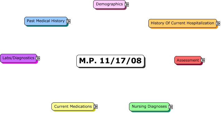 This Concept Map, created with IHMC CmapTools, has information related to: 11-17 CMAP Caddle, Cardiac Enzymes 11/17 CK=298 CKMB=5.9 Troponin T=0.85, Furosemide Physician's Order 80mg PO BID, Simvastatin Pertinent Lab Values LFT's and baseline FLP, Risk for impaired gas exchange related to alveolar incapacitation with history of smoking and COPD. Intervention Keep environment allergen/pollutant free to reduce irritation of airway., Gen. Chem. 11/17 Ca=8.9 Gluc=102 BUN=65 Cr=5.16 Na=141 K=5.6 Cl=105 CO2=22, Cardiac Enzymes Interpretation CKMB was grossly elevated, now within range. CK slightly elevated now. Client is rule out for myocardial infarction., Metolazone Physician's Order 5mg PO daily, Furosemide Nursing Indications Potassium wasting, Assess hydration & electrolytes. Administer in morning to avoid disrupting sleep., Calcium Acetate Pertinent Labs Ca= 8.9, Furosemide Brand Name Lasix, Metolazone Brand Name Zaroxolyn, Integumentary 16:00 22 Gauge primary line in left forearm patent, no redness, swelling, or other signs of infection. Appropriately moist and warm to touch, mobile with adequate turgor. No signs of breakdown on sacrum, back or heels. Large area of ecchymosis, left hand., Furosemide Pertinent Lab Values Last K value=5.6, Sodium Polystyrene Sulfonate Physician's Order 15g PO BID, Omeprazole Reason for Recieving To reduce gastric acid, Carvedilol Physician's Order 12.5mg PO BID hold SBP or HRឧ, Carvedilol Brand Name Coreg, Heparin Reason for Recieving Prevention of DVT, Calcitriol Classification Parathyroid agent, Vitamin D hormone, Omeprazole Nursing Indications Assess the GI system, administer before eating