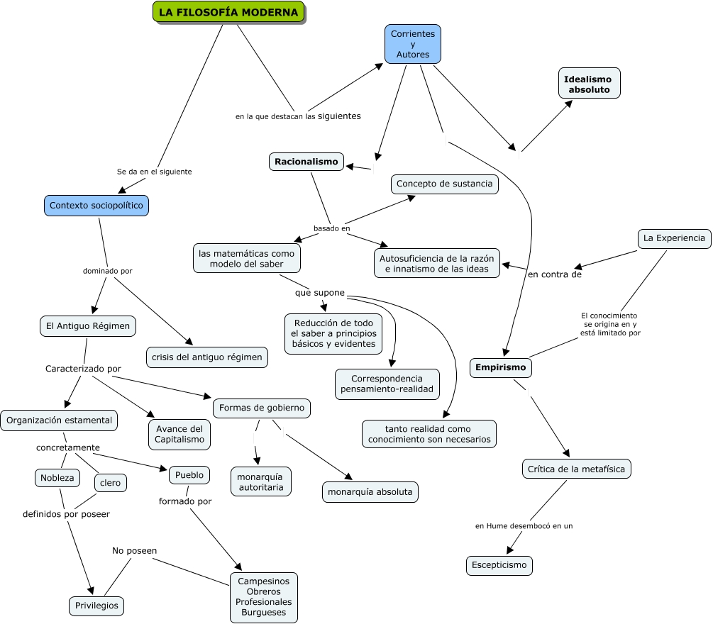 Este Cmap, tiene información relacionada con: filosofia moderna, Empirismo Crítica de la metafísica, clero definidos por poseer Privilegios, Crítica de la metafísica en Hume desembocó en un Escepticismo, LA FILOSOFÍA MODERNA en la que destacan las siguientes Corrientes y Autores, El Antiguo Régimen Caracterizado por Formas de gobierno, Organización estamental concretamente clero, Pueblo formado por Campesinos Obreros Profesionales Burgueses, Formas de gobierno monarquía autoritaria, Racionalismo basado en las matemáticas como modelo del saber, Contexto sociopolítico dominado por El Antiguo Régimen, Organización estamental concretamente Pueblo, Racionalismo basado en Concepto de sustancia, Formas de gobierno monarquía absoluta, La Experiencia en contra de Autosuficiencia de la razón e innatismo de las ideas, El Antiguo Régimen Caracterizado por Organización estamental, Nobleza definidos por poseer Privilegios, Campesinos Obreros Profesionales Burgueses No poseen Privilegios, las matemáticas como modelo del saber que supone Reducción de todo el saber a principios básicos y evidentes, Corrientes y Autores Racionalismo, El Antiguo Régimen Caracterizado por Avance del Capitalismo