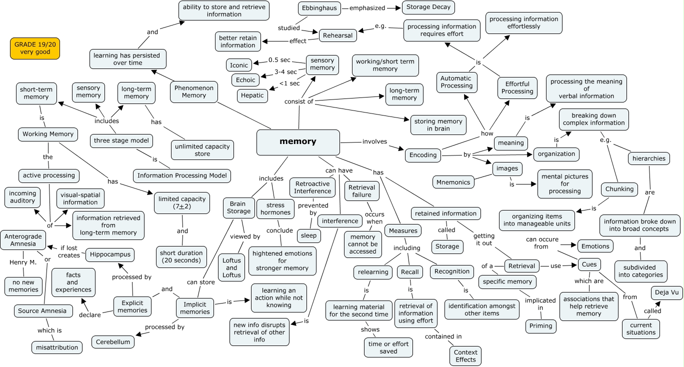 This Concept Map, created with IHMC CmapTools, has information related to: memory; jarrodscheele, Ebbinghaus emphasized Storage Decay, sensory memory ə sec Hepatic, memory ???? learning has persisted over time, sensory memory 0.5 sec Iconic, Cues which are associations that help retrieve memory, breaking down complex information e.g. Chunking, memory can have Retrieval failure, breaking down complex information e.g. hierarchies, short-term memory is Working Memory, Brain Storage viewed by Loftus and Loftus, Implicit memories is learning an action while not knowing, memory ???? Phenomenon Memory, relearning is learning material for the second time, memory has Measures, Recognition is identification amongst other items, learning has persisted over time and ability to store and retrieve information, learning material for the second time shows time or effort saved, Implicit memories and Explicit memories, Retroactive Interference prevented by sleep, memory can have interference
