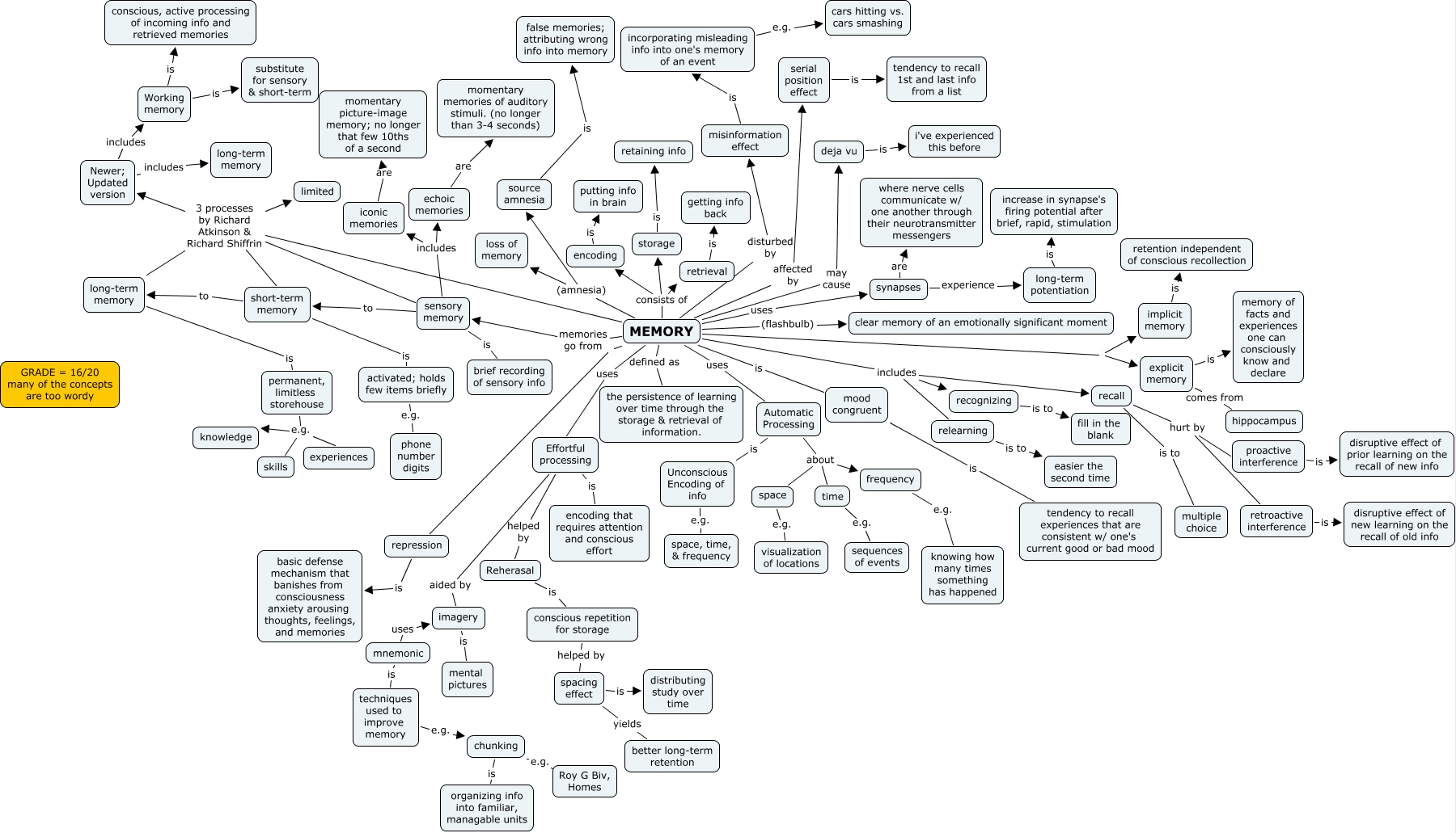 This Concept Map, created with IHMC CmapTools, has information related to: West Calhoun ch 8, chunking is organizing info into familiar, managable units, Automatic Processing about time, MEMORY 3 processes by Richard Atkinson & Richard Shiffrin limited, mnemonic uses imagery, MEMORY implicit memory, MEMORY (amnesia) source amnesia, incorporating misleading info into one's memory of an event e.g. cars hitting vs. cars smashing, MEMORY defined as the persistence of learning over time through the storage & retrieval of information., iconic memories are momentary picture-image memory; no longer that few 10ths of a second, Working memory is conscious, active processing of incoming info and retrieved memories, storage is retaining info, MEMORY repression, Newer; Updated version includes long-term memory, synapses experience long-term potentiation, short-term memory is activated; holds few items briefly, chunking e.g. Roy G Biv, Homes, MEMORY may cause deja vu, MEMORY 3 processes by Richard Atkinson & Richard Shiffrin long-term memory, long-term potentiation is increase in synapse's firing potential after brief, rapid, stimulation, MEMORY (amnesia) loss of memory