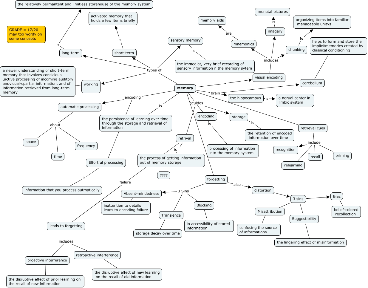 This Concept Map, created with IHMC CmapTools, has information related to: Kiel Boudreaux ch 8, short-term is activated memory that holds a few items briefly, leads to forgetting includes proactive interference, sensory memory is the immediat, very brief recording of sensory information n the memory sytem, Misattribution ???? confusing the source of informations, Memory types of working, retrieval cues include relearning, Transience ???? storage decay over time, Memory inculdes encoding, 3 sins ???? Bias, Memory types of long-term, Memory types of sensory memory, Memory inculdes retrival, visual encoding includes mnemonics, encoding is processing of information into the memory system, 3 sins ???? Suggestibility, cerebellum ???? helps to form and store the implicitmemories created by classical conditioning, retrieval cues include recognition, Memory is the persistence of learning over time through the storage and retrieval of information, retroactive interference ???? the disruptive effect of new learning on the recall of old information, forgetting 3 Sins Absent-mindedness