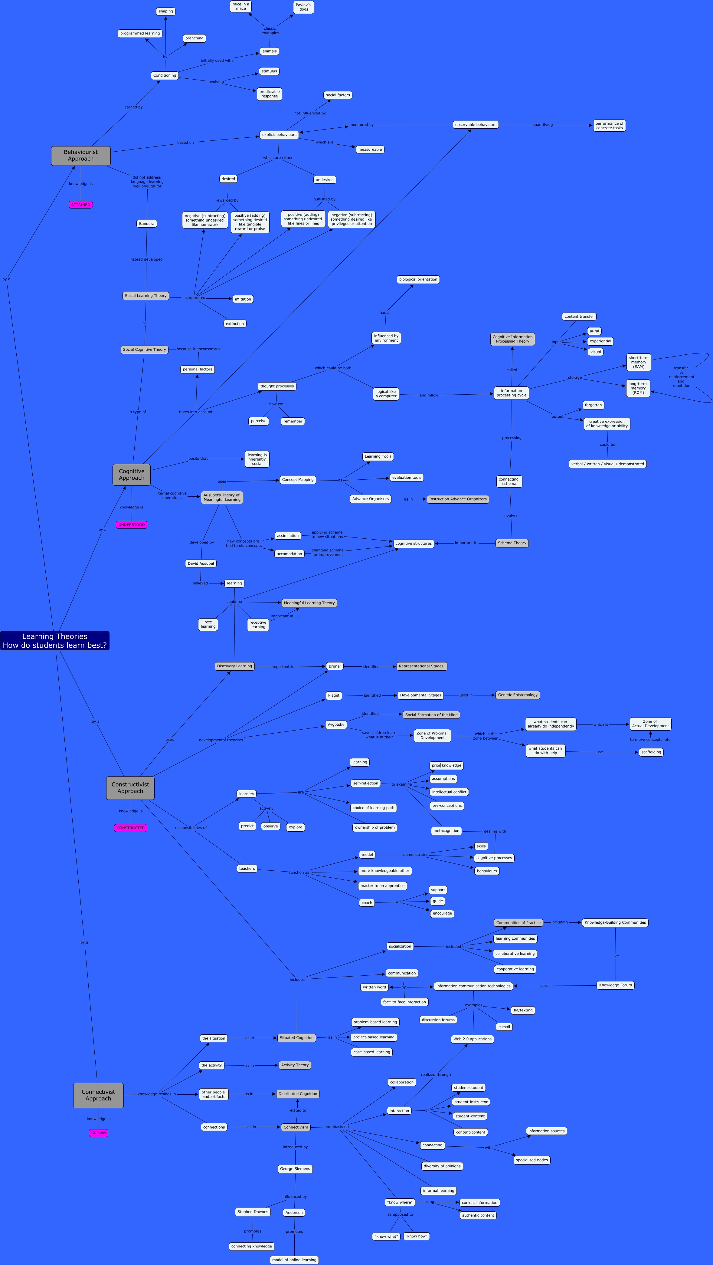 This Concept Map, created with IHMC CmapTools, has information related to: 512 FINAL, information processing cycle storage long-term memory (ROM), Knowledge-Building Communities like Knowledge Forum, Connectivist Approach knowledge is GROWN, the situation as in Situated Cognition, Piaget identified Developmental Stages, Social Learning Theory or Social Cognitive Theory, self-reflection to examine intellectual conflict, Social Learning Theory incorporates positive (adding) something desired like tangible reward or praise, Constructivist Approach includes communication, thought processes which could be both logical like a computer, information communication technologies examples Web 2.0 applications, Learning Theories How do students learn best? by a Connectivist Approach, self-reflection to examine prior knowledge, Stephen Downes promotes connecting knowledge, Conditioning initially used with animals, Behaviourist Approach learned by Conditioning, teachers function as coach, Ausubel's Theory of Meaningful Learning new concepts are tied to old concepts accomodation, model demonstrates behaviours, scaffolding to move concepts into Zone of Actual Development