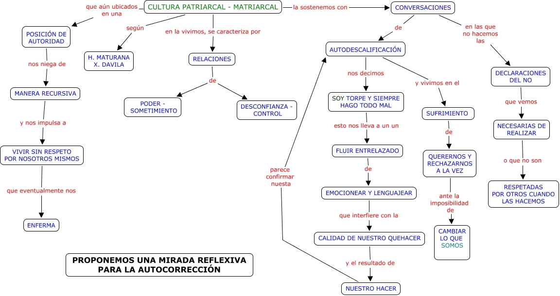 Este Cmap, tiene información relacionada con: CULTURAL PATRIARCAL - MATRIARCAL, POSICIÓN DE AUTORIDAD nos niega de MANERA RECURSIVA, CALIDAD DE NUESTRO QUEHACER y el resultado de NUESTRO HACER, CONVERSACIONES de AUTODESCALIFICACIÓN, CULTURA PATRIARCAL - MATRIARCAL que aún ubicados en una POSICIÓN DE AUTORIDAD, SOY TORPE Y SIEMPRE HAGO TODO MAL esto nos lleva a un un FLUIR ENTRELAZADO, CONVERSACIONES en las que no hacemos las DECLARACIONES DEL NO, VIVIR SIN RESPETO POR NOSOTROS MISMOS que eventualmente nos ENFERMA, NECESARIAS DE REALIZAR o que no son RESPETADAS POR OTROS CUANDO LAS HACEMOS, NUESTRO HACER parece confirmar nuesta AUTODESCALIFICACIÓN, QUERERNOS Y RECHAZARNOS A LA VEZ ante la imposibilidad de CAMBIAR LO QUE SOMOS, AUTODESCALIFICACIÓN y vivimos en el SUFRIMIENTO, CULTURA PATRIARCAL - MATRIARCAL la sostenemos con CONVERSACIONES, DECLARACIONES DEL NO que vemos NECESARIAS DE REALIZAR, RELACIONES de PODER - SOMETIMIENTO, SUFRIMIENTO de QUERERNOS Y RECHAZARNOS A LA VEZ, FLUIR ENTRELAZADO de EMOCIONEAR Y LENGUAJEAR, AUTODESCALIFICACIÓN nos decimos SOY TORPE Y SIEMPRE HAGO TODO MAL, MANERA RECURSIVA y nos impulsa a VIVIR SIN RESPETO POR NOSOTROS MISMOS, CULTURA PATRIARCAL - MATRIARCAL según H. MATURANA X. DAVILA, RELACIONES de DESCONFIANZA - CONTROL