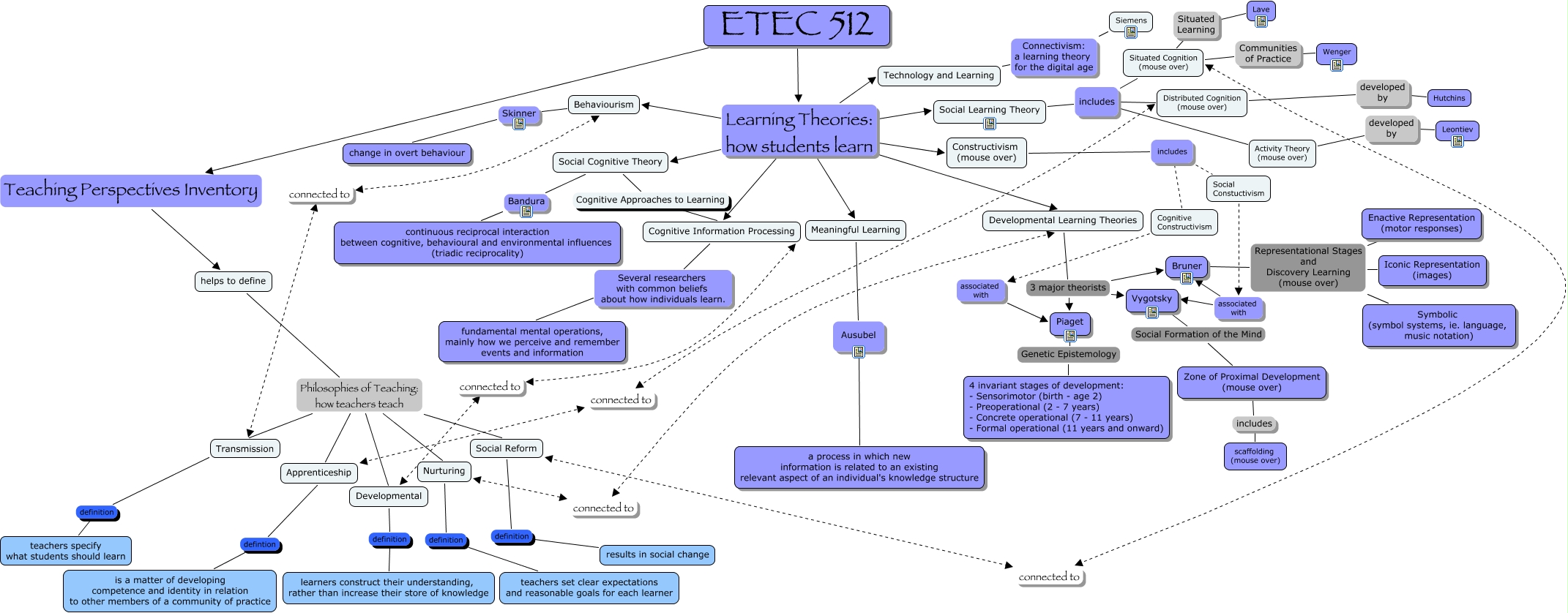 This Concept Map, created with IHMC CmapTools, has information related to: CMap.CamilleMaydonik.FINAL, Behaviourism Skinner change in overt behaviour, helps to define Philosophies of Teaching: how teachers teach Social Reform, Social Learning Theory includes Activity Theory (mouse over), Cognitive Constructivism associated with Piaget, is a matter of developing competence and identity in relation to other members of a community of practice defintion Apprenticeship, ETEC 512 Learning Theories: how students learn Technology and Learning, Zone of Proximal Development (mouse over) includes scaffolding (mouse over), Social Learning Theory includes Distributed Cognition (mouse over), Bruner Representational Stages and Discovery Learning (mouse over) Symbolic (symbol systems, ie. language, music notation), teachers set clear expectations and reasonable goals for each learner definition Nurturing, Bruner Representational Stages and Discovery Learning (mouse over) Iconic Representation (images), Bruner Representational Stages and Discovery Learning (mouse over) Enactive Representation (motor responses), teachers specify what students should learn definition Transmission, Developmental connected to Cognitive Information Processing, Activity Theory (mouse over) developed by Leontiev, helps to define Philosophies of Teaching: how teachers teach Developmental, learners construct their understanding, rather than increase their store of knowledge definition Developmental, Piaget Genetic Epistemology 4 invariant stages of development: - Sensorimotor (birth - age 2) - Preoperational (2 - 7 years) - Concrete operational (7 - 11 years) - Formal operational (11 years and onward), Developmental Learning Theories 3 major theorists Piaget, Situated Cognition (mouse over) Situated Learning Lave
