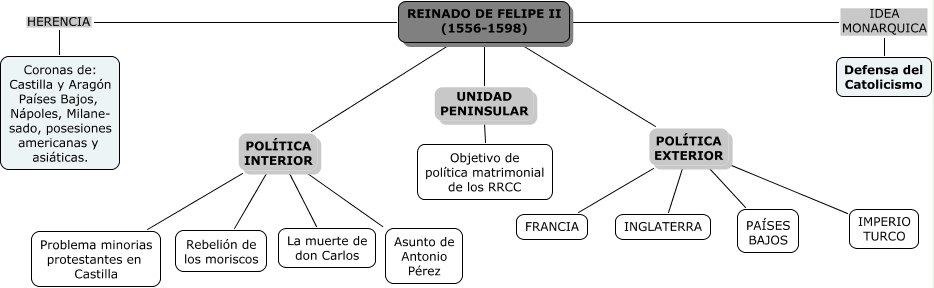 Este Cmap, tiene información relacionada con: Reinado de Felipe II, REINADO DE FELIPE II (1556-1598) POLÍTICA EXTERIOR PAÍSES BAJOS, REINADO DE FELIPE II (1556-1598) POLÍTICA EXTERIOR IMPERIO TURCO, REINADO DE FELIPE II (1556-1598) POLÍTICA EXTERIOR FRANCIA, REINADO DE FELIPE II (1556-1598) POLÍTICA INTERIOR La muerte de don Carlos, REINADO DE FELIPE II (1556-1598) POLÍTICA INTERIOR Asunto de Antonio Pérez, REINADO DE FELIPE II (1556-1598) HERENCIA Coronas de: Castilla y Aragón Países Bajos, Nápoles, Milane- sado, posesiones americanas y asiáticas., REINADO DE FELIPE II (1556-1598) POLÍTICA INTERIOR Rebelión de los moriscos, REINADO DE FELIPE II (1556-1598) IDEA MONARQUICA Defensa del Catolicismo, REINADO DE FELIPE II (1556-1598) POLÍTICA EXTERIOR INGLATERRA, REINADO DE FELIPE II (1556-1598) UNIDAD PENINSULAR Objetivo de política matrimonial de los RRCC, REINADO DE FELIPE II (1556-1598) POLÍTICA INTERIOR Problema minorias protestantes en Castilla