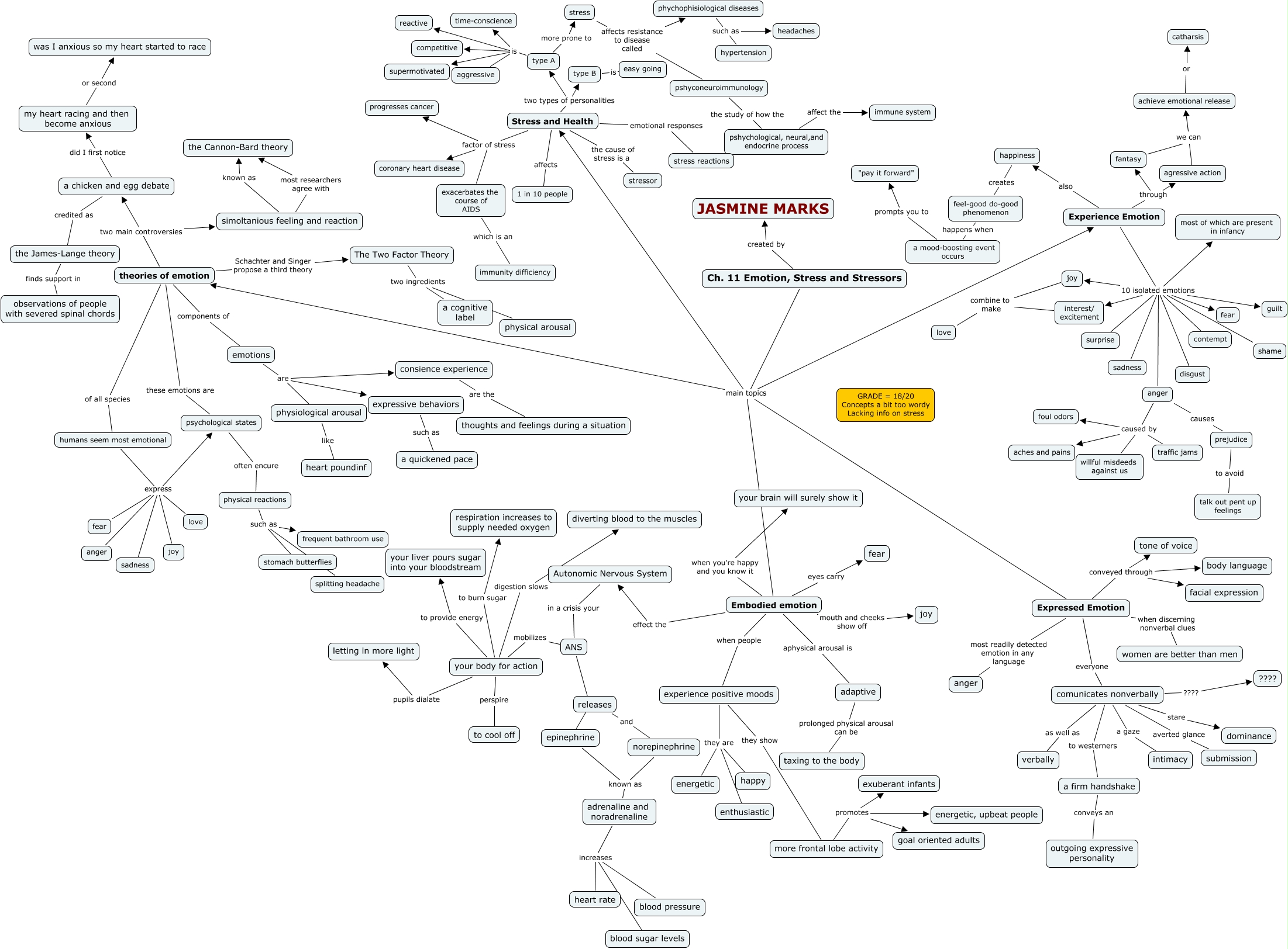 This Concept Map, created with IHMC CmapTools, has information related to: Jasmine Marks ch. 11 PSY2012, norepinephrine known as adrenaline and noradrenaline, Stress and Health the cause of stress is a stressor, theories of emotion components of emotions, Stress and Health affects 1 in 10 people, Ch. 11 Emotion, Stress and Stressors main topics Experience Emotion, Experience Emotion through agressive action, Experience Emotion 10 isolated emotions fear, experience positive moods they are energetic, more frontal lobe activity promotes goal oriented adults, Experience Emotion 10 isolated emotions surprise, releases and norepinephrine, sadness express fear, Ch. 11 Emotion, Stress and Stressors main topics theories of emotion, Expressed Emotion conveyed through tone of voice, emotions are physiological arousal, your body for action to provide energy your liver pours sugar into your bloodstream, a chicken and egg debate credited as the James-Lange theory, sadness express anger, Stress and Health factor of stress progresses cancer, your body for action digestion slows diverting blood to the muscles
