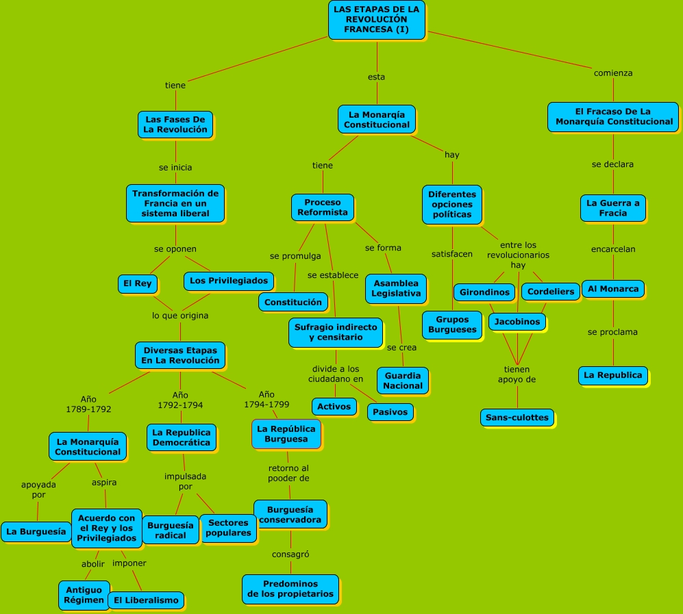 Este mapa conceptual tiene información relacionada a: las etapas de la revolución francesa (I) JUAN JESÚS CUBILES Nº10 4ºA, Acuerdo con el Rey y los Privilegiados imponer El Liberalismo, LAS ETAPAS DE LA REVOLUCIÓN FRANCESA (I) tiene Las Fases De La Revolución, Proceso Reformista se establece Sufragio indirecto y censitario, Proceso Reformista se promulga Constitución, Diferentes opciones políticas entre los revolucionarios hay Jacobinos, Diferentes opciones políticas entre los revolucionarios hay Girondinos, Los Privilegiados lo que origina Diversas Etapas En La Revolución, Las Fases De La Revolución se inicia Transformación de Francia en un sistema liberal, LAS ETAPAS DE LA REVOLUCIÓN FRANCESA (I) esta La Monarqía Constitucional, Girondinos tienen apoyo de Sans-culottes, LAS ETAPAS DE LA REVOLUCIÓN FRANCESA (I) comienza El Fracaso De La Monarquía Constitucional, Burguesía conservadora consagró Predominos de los propietarios, El Fracaso De La Monarquía Constitucional se declara La Guerra a Fracia, Asamblea Legislativa se crea Guardia Nacional, Jacobinos tienen apoyo de Sans-culottes, Sufragio indirecto y censitario divide a los ciudadano en Activos, Diversas Etapas En La Revolución Año 1789-1792 La Monarquía Constitucional, Transformación de Francia en un sistema liberal se oponen Los Privilegiados, Acuerdo con el Rey y los Privilegiados abolir Antiguo Régimen, La Republica Democrática impulsada por Sectores populares