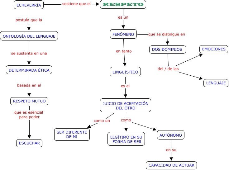 Este Cmap, tiene información relacionada con: Respeto según Echeverría, DETERMINADA ÉTICA basada en el RESPETO MUTUO, ECHEVERRÍA postula que la ONTOLOGÍA DEL LENGUAJE, RESPETO es un FENÓMENO, LINGUÍSTICO es el JUICIO DE ACEPTACIÓN DEL OTRO, DOS DOMINIOS del / de las EMOCIONES, JUICIO DE ACEPTACIÓN DEL OTRO como LEGÍTIMO EN SU FORMA DE SER, RESPETO MUTUO que es esencial para poder ESCUCHAR, JUICIO DE ACEPTACIÓN DEL OTRO como AUTÓNOMO, AUTÓNOMO en su CAPACIDAD DE ACTUAR, DOS DOMINIOS del / de las LENGUAJE, FENÓMENO que se distingue en DOS DOMINIOS, FENÓMENO en tanto LINGUÍSTICO, ECHEVERRÍA sostiene que el RESPETO, ONTOLOGÍA DEL LENGUAJE se sustenta en una DETERMINADA ÉTICA, JUICIO DE ACEPTACIÓN DEL OTRO como un SER DIFERENTE DE MÍ