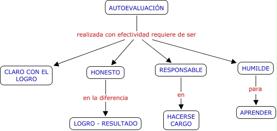 Este Cmap, tiene información relacionada con: Autoevaluación, AUTOEVALUACIÓN realizada con efectividad requiere de ser CLARO CON EL LOGRO, HONESTO en la diferencia LOGRO - RESULTADO, AUTOEVALUACIÓN realizada con efectividad requiere de ser RESPONSABLE, AUTOEVALUACIÓN realizada con efectividad requiere de ser HUMILDE, HUMILDE para APRENDER, AUTOEVALUACIÓN realizada con efectividad requiere de ser HONESTO, RESPONSABLE en HACERSE CARGO