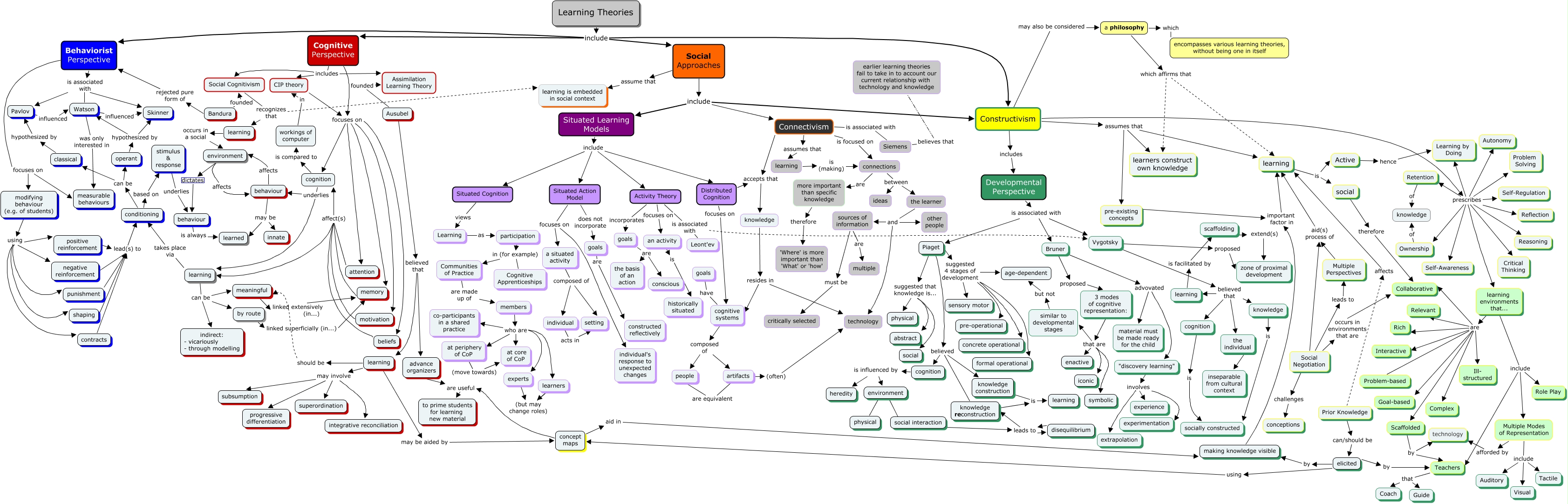 This Concept Map, created with IHMC CmapTools, has information related to: ETEC512Drebot2-Nov29, learning is Active, Piaget suggested that knowledge is... physical, advance organizers are useful to prime students for learning new material, Active hence Learning by Doing, Constructivism prescribes Reasoning, an activity is historically situated, environment social interaction, Behaviorist Perspective focuses on modifying behaviour (e.g. of students), Siemens believes that earlier learning theories fail to take in to account our current relationship with technology and knowledge, Cognitive Perspective focuses on beliefs, Activity Theory incorporates goals, Retention of knowledge, 3 modes of cognitive representation: that are symbolic, Constructivism may also be considered a philosophy, Situated Learning Models include Activity Theory, classical hypothesized by Pavlov, Behaviorist Perspective is associated with Pavlov, Situated Cognition views Learning, Social Negotiation challenges conceptions, Situated Learning Models include Situated Cognition