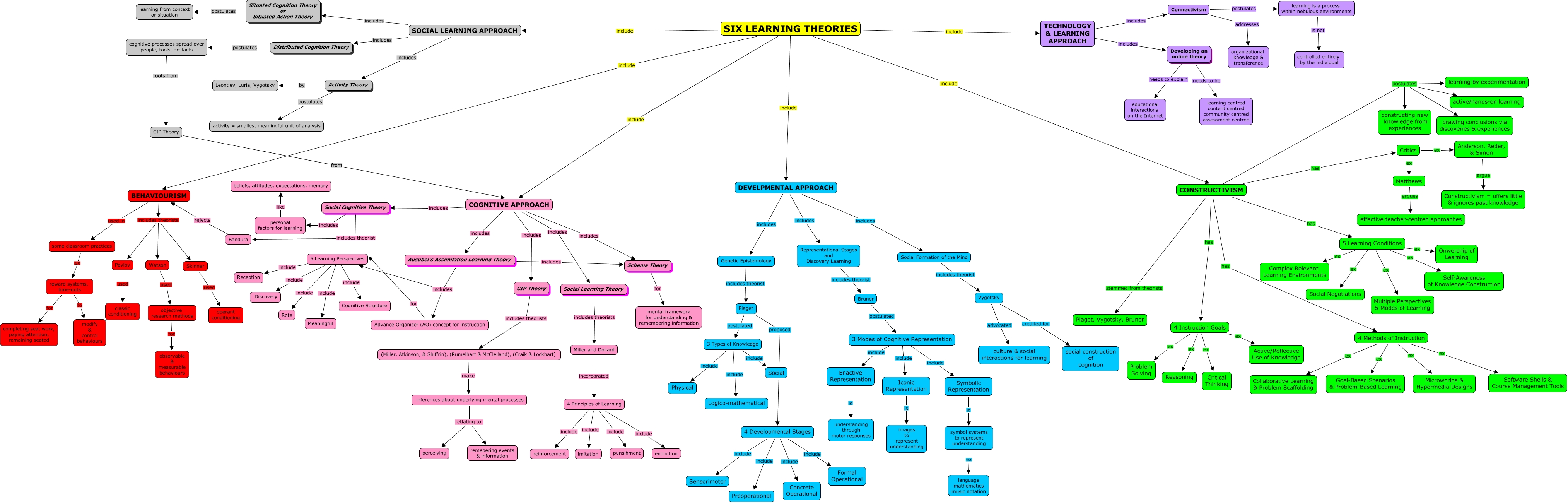 This Concept Map, created with IHMC CmapTools, has information related to: Final Draft, SIX LEARNING THEORIES include SOCIAL LEARNING APPROACH, 4 Principles of Learning include extinction, Skinner used operant conditioning, 3 Types of Knowledge include Logico-mathematical, 4 Instruction Goals ex Reasoning, Genetic Epistemology includes theorist Piaget, 4 Developmental Stages include Preoperational, Vygotsky advocated culture & social interactions for learning, 5 Learning Perspectves include Rote, Piaget postulated 3 Types of Knowledge, Ausubel's Assimilation Learning Theory includes Advance Organizer (AO) concept for instruction, 4 Principles of Learning include punsihment, reward systems, time-outs for completing seat work, paying attention, remaining seated, 4 Principles of Learning include reinforcement, personal factors for learning like beliefs, attitudes, expectations, memory, DEVELPMENTAL APPROACH includes Genetic Epistemology, 4 Developmental Stages include Concrete Operational, (Miller, Atkinson, & Shiffrin), (Rumelhart & McClelland), (Craik & Lockhart) make inferences about underlying mental processes, Connectivism postulates learning is a process within nebulous environments, 5 Learning Conditions ex Complex Relevant Learning Environments