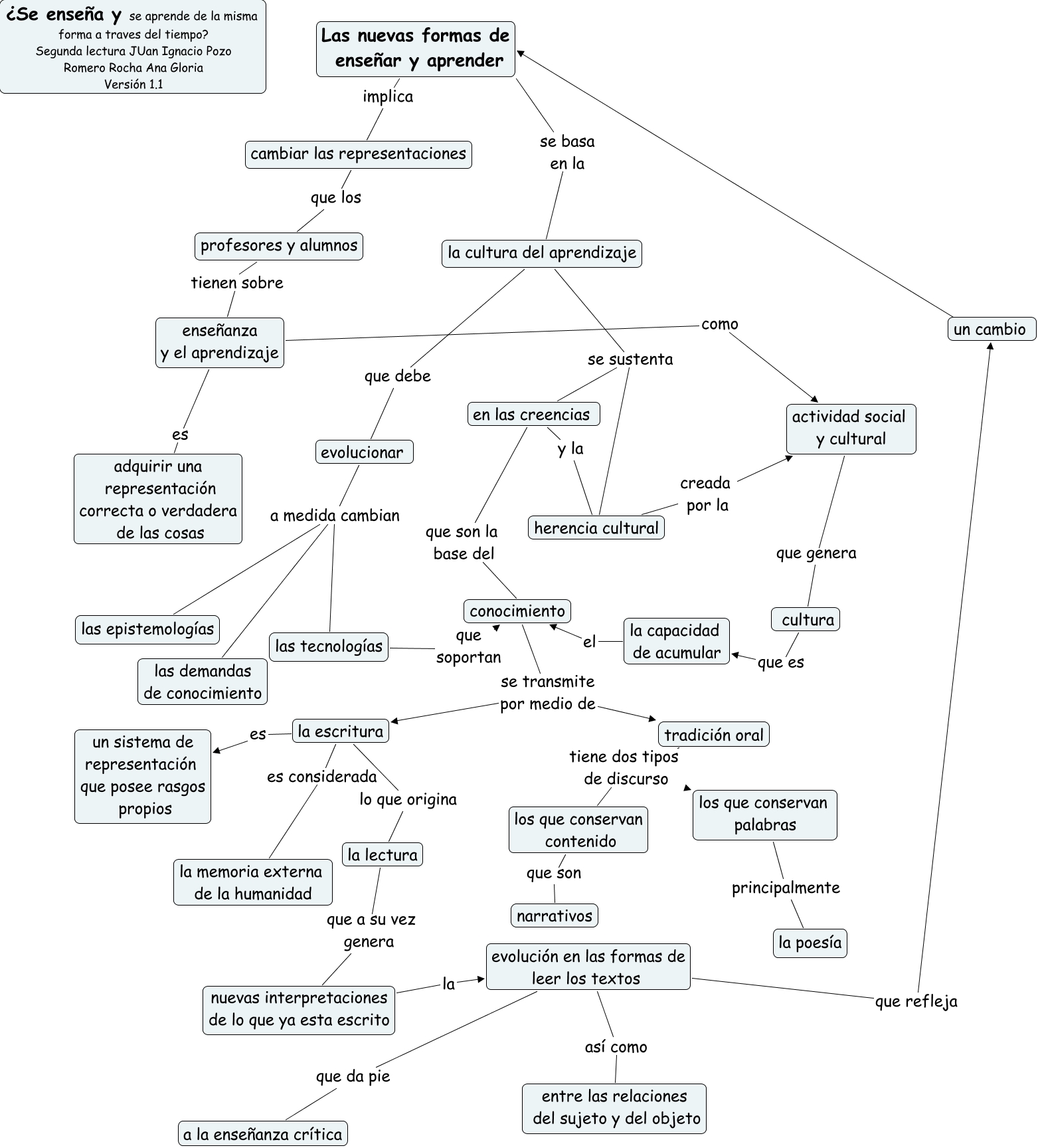 Este Cmap, tiene información relacionada con: 1.1, la cultura del aprendizaje se sustenta en las creencias, la cultura del aprendizaje se sustenta herencia cultural, Las nuevas formas de enseñar y aprender se basa en la la cultura del aprendizaje, nuevas interpretaciones de lo que ya esta escrito la evolución en las formas de leer los textos, conocimiento se transmite por medio de la escritura, los que conservan palabras principalmente la poesía, los que conservan contenido que son narrativos, la cultura del aprendizaje que debe evolucionar, evolución en las formas de leer los textos que da pie a la enseñanza crítica, en las creencias que son la base del conocimiento, conocimiento se transmite por medio de tradición oral, enseñanza y el aprendizaje es adquirir una representación correcta o verdadera de las cosas, la escritura es un sistema de representación que posee rasgos propios, en las creencias y la herencia cultural, tradición oral tiene dos tipos de discurso los que conservan contenido, cambiar las representaciones que los profesores y alumnos, evolucionar a medida cambian las epistemologías, evolución en las formas de leer los textos así como entre las relaciones del sujeto y del objeto, la escritura lo que origina la lectura, un cambio en Las nuevas formas de enseñar y aprender