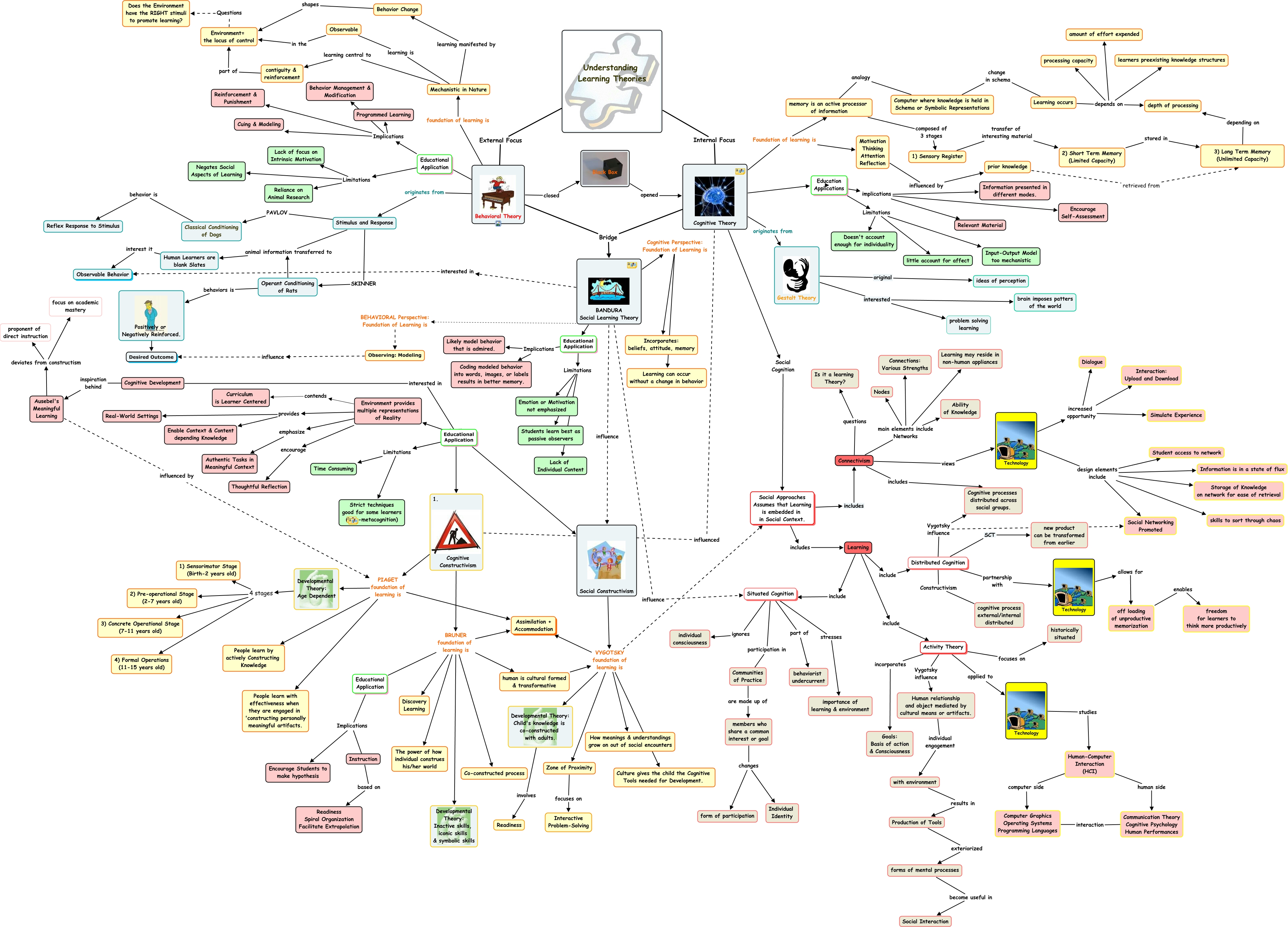 This Concept Map, created with IHMC CmapTools, has information related to: Sabrina Fonagy FINAL Concept Map, Environment provides multiple representations of Reality encourage Thoughtful Reflection, Behavioral Theory Bridge Cognitive Theory, memory is an active processor of information analogy Computer where knowledge is held in Schema or Symbolic Representations, 1. Cognitive Constructivism education implication Environment provides multiple representations of Reality, BANDURA Social Learning Theory interested in Observable Behavior, Operant Conditioning of Rats animal information transferred to Human Learners are blank Slates, Education Applications Limitations Input-Output Model too mechanistic, Distributed Cognition partnership with Technology, human is cultural formed & transformative VYGOTSKY foundation of learning is Zone of Proximity, Connectivism questions Is it a learning Theory?, Ausebel's Meaningful Learning deviates from constructism focus on academic mastery, Distributed Cognition Vygotsky influence Cognitive processes distributed across social groups., Connectivism main elements include Networks Ability of Knowledge, human is cultural formed & transformative VYGOTSKY foundation of learning is Social Approaches Assumes that Learning is embedded in in Social Context., Understanding Learning Theories Internal Focus Cognitive Theory, Cognitive Theory Foundation of learning is Motivation Thinking Attention Reflection, 1. Cognitive Constructivism BRUNER foundation of learning is Assimilation + Accommodation, Educational Application Implications Cuing & Modeling, Behavioral Theory foundation of learning is Mechanistic in Nature, BANDURA Social Learning Theory BEHAVIORAL Perspective: Foundation of Learning is Observing: Modeling
