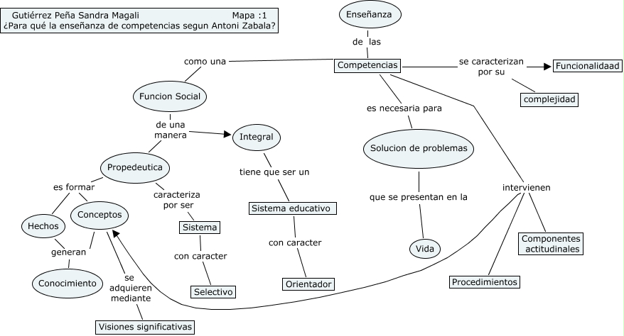 Este Cmap, tiene información relacionada con: competencias, Competencias es necesaria para Solucion de problemas, Conceptos se adquieren mediante Visiones significativas, Competencias se caracterizan por su complejidad, Competencias intervienen Componentes actitudinales, Competencias se caracterizan por su Funcionalidaad, Hechos generan Conocimiento, Solucion de problemas que se presentan en la Vida, Propedeutica es formar Conceptos, Competencias intervienen Conceptos, Conceptos generan Conocimiento, Sistema con caracter Selectivo, Competencias como una Funcion Social, Funcion Social de una manera Propedeutica, Funcion Social de una manera Integral, Integral tiene que ser un Sistema educativo, Propedeutica es formar Hechos, Propedeutica caracteriza por ser Sistema, Competencias intervienen Procedimientos, Sistema educativo con caracter Orientador, Enseñanza de las Competencias