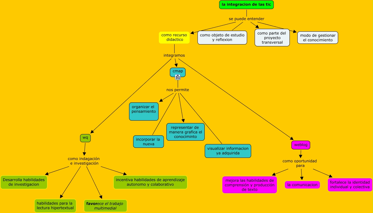 Este Cmap, tiene información relacionada con: integracion pedagogica, weblog como oportunidad para mejora las habilidades de comprensión y producción de texto, la integracion de las tic se puede entender modo de gestionar el conocimiento, la integracion de las tic se puede entender como parte del proyecto transversal, cmap nos permite incorporar la nueva, cmap nos permite representar de manera grafica el conociminto, wq como indagación e investigación favorece el trabajo multimedial, la integracion de las tic se puede entender como objeto de estudio y reflexion, weblog como oportunidad para la comunicacion, wq como indagación e investigación incentiva habilidades de aprendizaje autonomo y colaborativo, como recurso didactico integramos cmap, wq como indagación e investigación habilidades para la lectura hipertextual, wq como indagación e investigación Desarrolla habilidades de investigacion, cmap nos permite visualizar informacion ya adquirida, como recurso didactico integramos wq, weblog como oportunidad para fortalece la identidad individual y colectiva, como recurso didactico integramos weblog, la integracion de las tic se puede entender como recurso didactico, cmap nos permite organizar el pensamiento