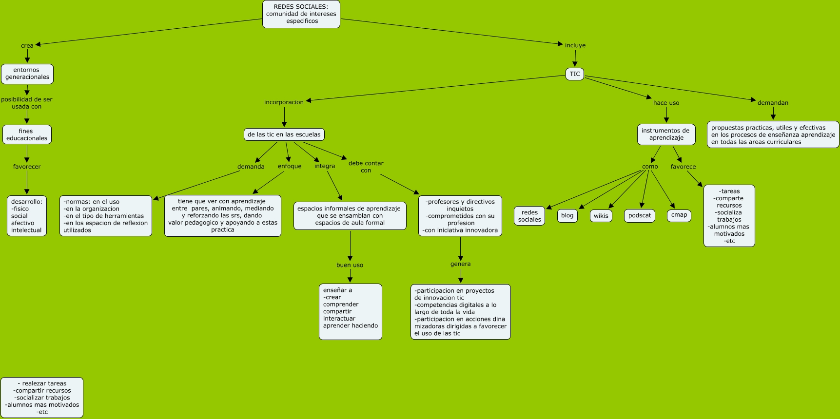 Este Cmap, tiene información relacionada con: srs, instrumentos de aprendizaje como cmap, instrumentos de aprendizaje como podscat, -profesores y directivos inquietos -comprometidos con su profesion -con iniciativa innovadora genera -participacion en proyectos de innovacion tic -competencias digitales a lo largo de toda la vida -participacion en acciones dina mizadoras dirigidas a favorecer el uso de las tic, REDES SOCIALES: comunidad de intereses especificos incluye TIC, espacios informales de aprendizaje que se ensamblan con espacios de aula formal buen uso enseñar a -crear comprender compartir interactuar aprender haciendo, instrumentos de aprendizaje como redes sociales, de las tic en las escuelas integra espacios informales de aprendizaje que se ensamblan con espacios de aula formal, de las tic en las escuelas debe contar con -profesores y directivos inquietos -comprometidos con su profesion -con iniciativa innovadora, entornos generacionales posibilidad de ser usada con fines educacionales, REDES SOCIALES: comunidad de intereses especificos crea entornos generacionales, instrumentos de aprendizaje como wikis, de las tic en las escuelas enfoque tiene que ver con aprendizaje entre pares, animando, mediando y reforzando las srs, dando valor pedagogico y apoyando a estas practica, TIC incorporacion de las tic en las escuelas, TIC demandan propuestas practicas, utiles y efectivas en los procesos de enseñanza aprendizaje en todas las areas curriculares, de las tic en las escuelas demanda -normas: en el uso -en la organizacion -en el tipo de herramientas -en los espacion de reflexion utilizados, fines educacionales favorecer desarrollo: -fisico social afectivo intelectual, TIC hace uso instrumentos de aprendizaje, instrumentos de aprendizaje como blog, instrumentos de aprendizaje favorece -tareas -comparte recursos -socializa trabajos -alumnos mas motivados -etc