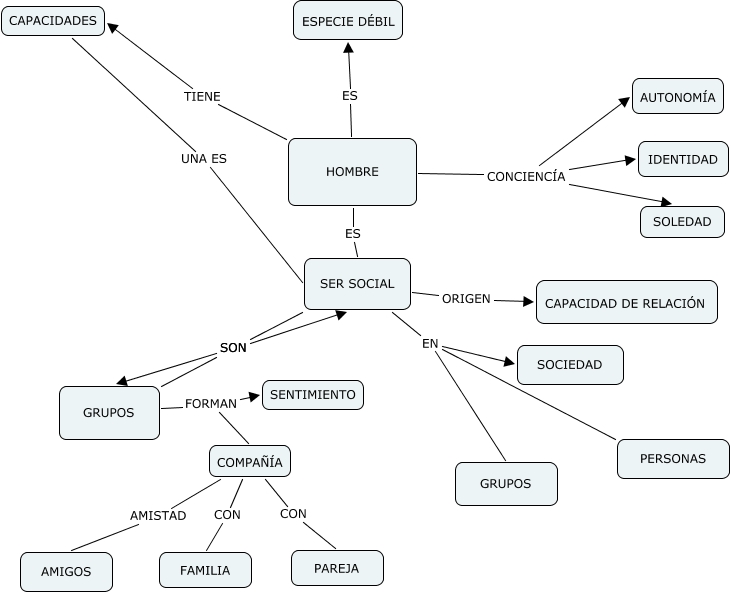 Este Cmap, tiene información relacionada con: EL HOMBRE, GRUPOS SON SER SOCIAL, SER SOCIAL EN GRUPOS, HOMBRE CONCIENCÍA SOLEDAD, CAPACIDADES UNA ES SER SOCIAL, HOMBRE CONCIENCÍA AUTONOMÍA, HOMBRE ES ESPECIE DÉBIL, SER SOCIAL EN SOCIEDAD, COMPAÑÍA CON PAREJA, SER SOCIAL SON GRUPOS, SER SOCIAL EN PERSONAS, COMPAÑÍA AMISTAD AMIGOS, HOMBRE CONCIENCÍA IDENTIDAD, SER SOCIAL ORIGEN CAPACIDAD DE RELACIÓN, GRUPOS FORMAN SENTIMIENTO, HOMBRE ES SER SOCIAL, HOMBRE TIENE CAPACIDADES, COMPAÑÍA CON FAMILIA, GRUPOS FORMAN COMPAÑÍA