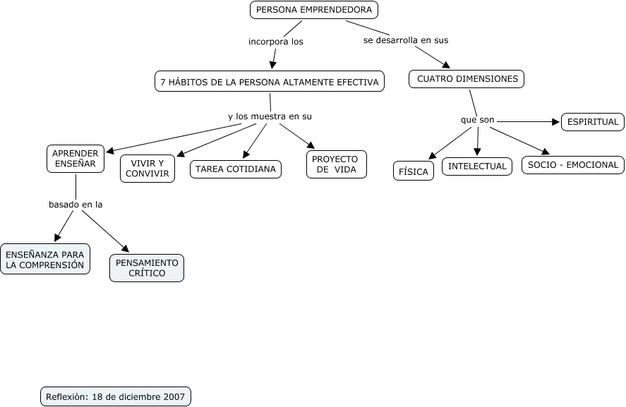 Este Cmap, tiene información relacionada con: Persona emprendedora, 7 HÁBITOS DE LA PERSONA ALTAMENTE EFECTIVA y los muestra en su VIVIR Y CONVIVIR, 7 HÁBITOS DE LA PERSONA ALTAMENTE EFECTIVA y los muestra en su APRENDER ENSEÑAR, PERSONA EMPRENDEDORA incorpora los 7 HÁBITOS DE LA PERSONA ALTAMENTE EFECTIVA, APRENDER ENSEÑAR basado en la PENSAMIENTO CRÍTICO, PERSONA EMPRENDEDORA se desarrolla en sus CUATRO DIMENSIONES, CUATRO DIMENSIONES que son ESPIRITUAL, 7 HÁBITOS DE LA PERSONA ALTAMENTE EFECTIVA y los muestra en su PROYECTO DE VIDA, 7 HÁBITOS DE LA PERSONA ALTAMENTE EFECTIVA y los muestra en su TAREA COTIDIANA, CUATRO DIMENSIONES que son INTELECTUAL, CUATRO DIMENSIONES que son SOCIO - EMOCIONAL, CUATRO DIMENSIONES que son FÍSICA, APRENDER ENSEÑAR basado en la ENSEÑANZA PARA LA COMPRENSIÓN