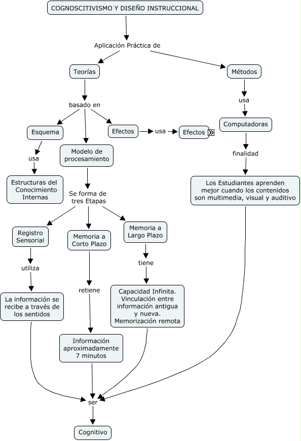 Este Cmap, tiene información relacionada con: Cognoscitivismo y Diseño Instruccional, Efectos usa Efectos, COGNOSCITIVISMO Y DISEÑO INSTRUCCIONAL Aplicación Práctica de Métodos, Modelo de procesamiento Se forma de tres Etapas Registro Sensorial, Métodos usa Computadoras, Memoria a Corto Plazo retiene Información aproximadamente 7 minutos, Los Estudiantes aprenden mejor cuando los contenidos son multimedia, visual y auditivo ser Cognitivo, Teorías basado en Efectos, Memoria a Largo Plazo tiene Capacidad Infinita. Vinculación entre información antigua y nueva. Memorización remota, Modelo de procesamiento Se forma de tres Etapas Memoria a Largo Plazo, Información aproximadamente 7 minutos ser Cognitivo, Capacidad Infinita. Vinculación entre información antigua y nueva. Memorización remota ser Cognitivo, La información se recibe a través de los sentidos ser Cognitivo, Teorías basado en Modelo de procesamiento, Registro Sensorial utiliza La información se recibe a través de los sentidos, Esquema usa Estructuras del Conocimiento Internas, Modelo de procesamiento Se forma de tres Etapas Memoria a Corto Plazo, COGNOSCITIVISMO Y DISEÑO INSTRUCCIONAL Aplicación Práctica de Teorías, Computadoras finalidad Los Estudiantes aprenden mejor cuando los contenidos son multimedia, visual y auditivo, Teorías basado en Esquema