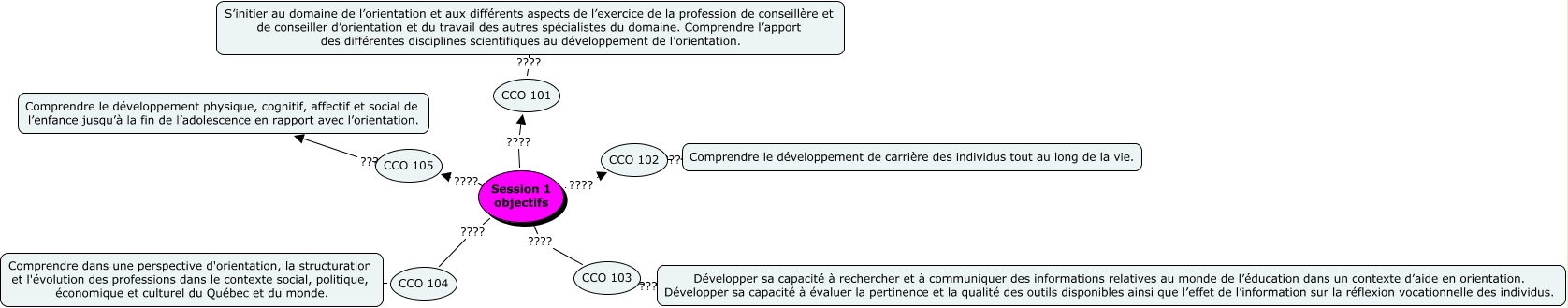 Cette carte conceptuelle, cree avec IHMC CmapTools, contient des informations liees a : Objectifs session 1, Session 1 objectifs ???? CCO 101, Session 1 objectifs ???? CCO 103, CCO 103 ???? Développer sa capacité à rechercher et à communiquer des informations relatives au monde de l’éducation dans un contexte d’aide en orientation. Développer sa capacité à évaluer la pertinence et la qualité des outils disponibles ainsi que l’effet de l’information sur la réflexion vocationnelle des individus., CCO 101 ???? S’initier au domaine de l’orientation et aux différents aspects de l’exercice de la profession de conseillère et de conseiller d’orientation et du travail des autres spécialistes du domaine. Comprendre l’apport des différentes disciplines scientifiques au développement de l’orientation., CCO 104 ???? Comprendre dans une perspective d'orientation, la structuration et l'évolution des professions dans le contexte social, politique, économique et culturel du Québec et du monde., Session 1 objectifs ???? CCO 102, Session 1 objectifs ???? CCO 104, CCO 105 ???? Comprendre le développement physique, cognitif, affectif et social de l’enfance jusqu’à la fin de l’adolescence en rapport avec l’orientation., Session 1 objectifs ???? CCO 105, CCO 102 ???? Comprendre le développement de carrière des individus tout au long de la vie.