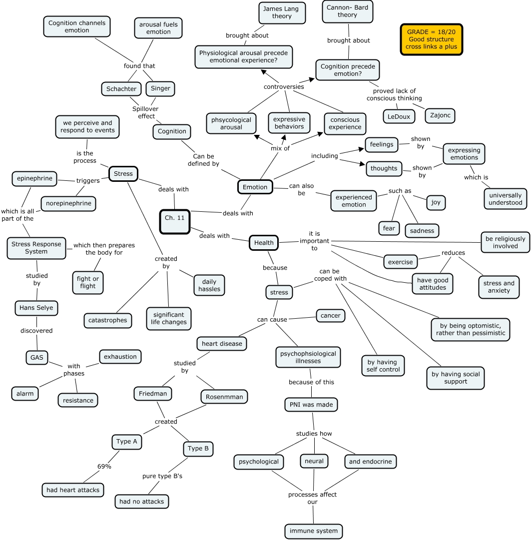 This Concept Map, created with IHMC CmapTools, has information related to: Ch.11 Shelby Crisco PSY0166, phsycological arousal controversies Cognition precede emotion?, Friedman created Type B, thoughts shown by expressing emotions, epinephrine which is all part of the Stress Response System, Hans Selye discovered GAS, Stress created by daily hassles, Stress created by significant life changes, feelings shown by expressing emotions, GAS with phases exhaustion, phsycological arousal controversies Physiological arousal precede emotional experience?, Ch. 11 deals with Health, Type B pure type B's had no attacks, Emotion including feelings, Health it is important to exercise, stress can be coped with by having self control, Cognition precede emotion? proved lack of conscious thinking LeDoux, Stress Response System studied by Hans Selye, heart disease studied by Rosenmman, neural processes affect our immune system, Rosenmman created Type B