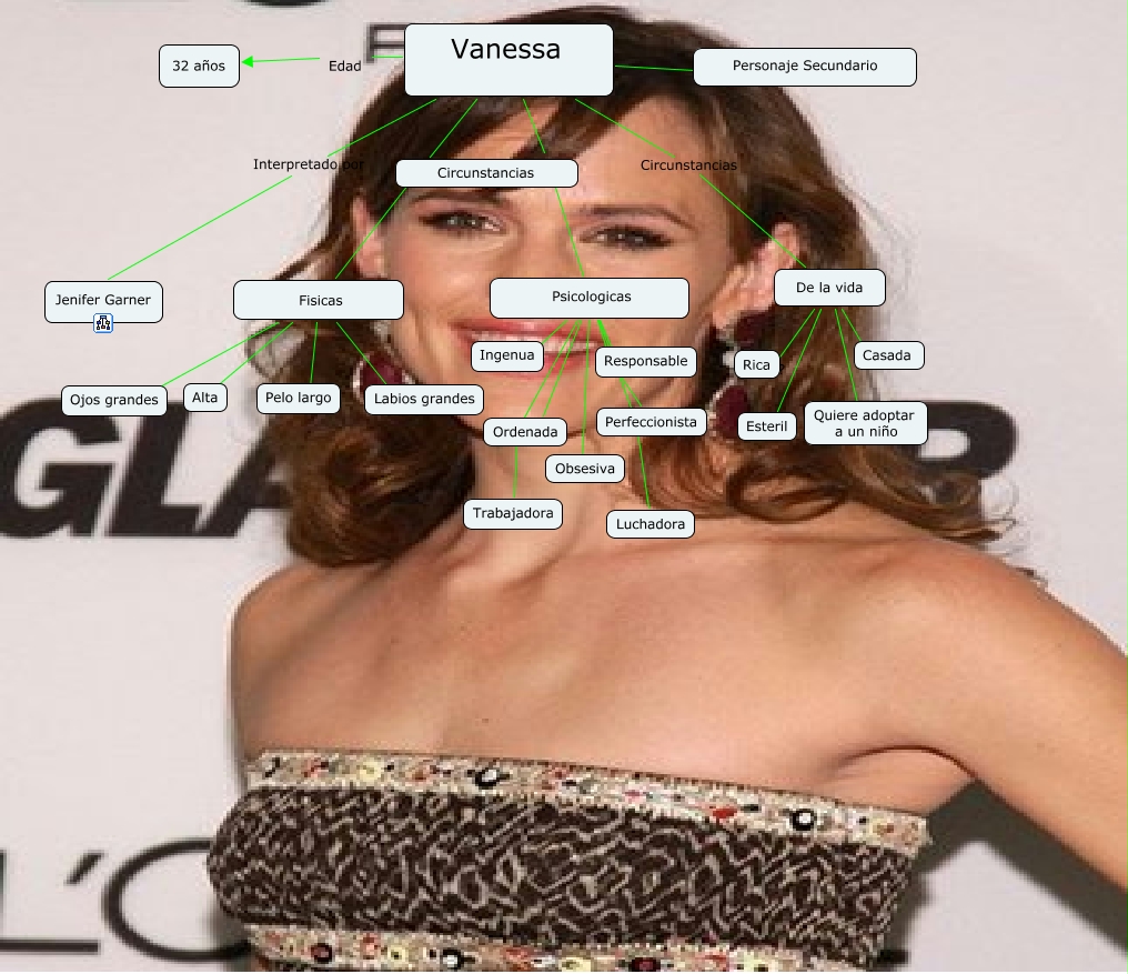 Este Cmap, tiene información relacionada con: Vanessa, Fisicas ???? Labios grandes, Psicologicas ???? Ordenada, De la vida ???? Rica, Psicologicas ???? Luchadora, Fisicas ???? Ojos grandes, Vanessa Edad 32 años, De la vida ???? Quiere adoptar a un niño, De la vida ???? Esteril, Fisicas ???? Pelo largo, Vanessa Circunstancias De la vida, Vanessa Interpretado por Jenifer Garner, Fisicas ???? Alta, Psicologicas ???? Responsable, Psicologicas ???? Trabajadora, De la vida ???? Casada, Psicologicas ???? Ingenua, Vanessa ???? Personaje Secundario, Psicologicas ???? Perfeccionista, Psicologicas ???? Obsesiva, Vanessa Psicologicas