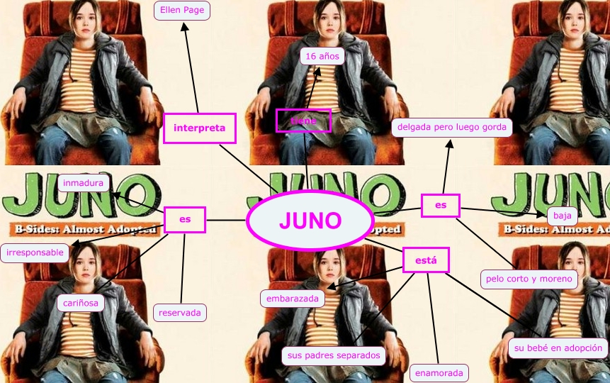 Este Cmap, tiene información relacionada con: juno personaje, JUNO está enamorada, JUNO tiene 16 años, JUNO está embarazada, JUNO está su bebé en adopción, JUNO es cariñosa, JUNO es pelo corto y moreno, JUNO está su bebé en adopción, JUNO es irresponsable, JUNO es delgada pero luego gorda, JUNO es reservada, JUNO está sus padres separados, JUNO interpreta Ellen Page, JUNO es baja, JUNO es inmadura