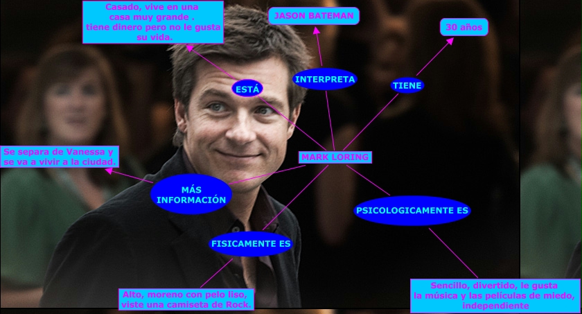 Este Cmap, tiene información relacionada con: mark loring, MARK LORING MÁS INFORMACIÓN Se separa de Vanessa y se va a vivir a la ciudad., MARK LORING PSICOLOGICAMENTE ES Sencillo, divertido, le gusta la música y las películas de miedo, independiente, MARK LORING ESTÁ Casado, vive en una casa muy grande . tiene dinero pero no le gusta su vida., MARK LORING FISICAMENTE ES Alto, moreno con pelo liso, viste una camiseta de Rock., MARK LORING TIENE 30 años, MARK LORING INTERPRETA JASON BATEMAN